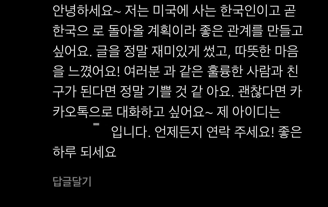 "미국에 사는 한국인인데 글이 너무 좋아 친구가 되고 싶다."