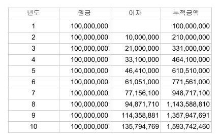 그다음 해에는 원래 모은 1억과 이것의 이자 1천만 원, 그리고 추가로 모은 원금 1억이 되어