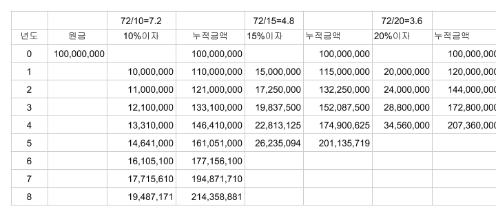 이 복리의 마법을 알게 되면 원금이 2배가 되는 시간도 예측이 가능하다.