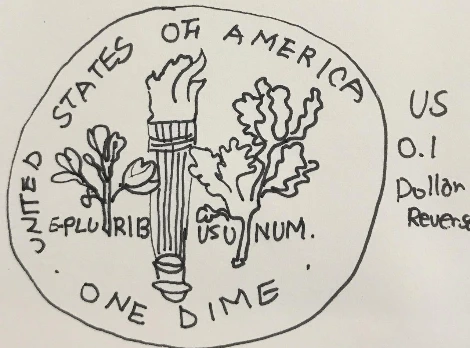 마지막으로 미국 동전 1 다임 뒷면. 왼쪽에 올리브 가지, 오른쪽에 오크 가지, 중간에 횃불이 보인다. 여기에도 역시나 라틴어가 쓰여있다.