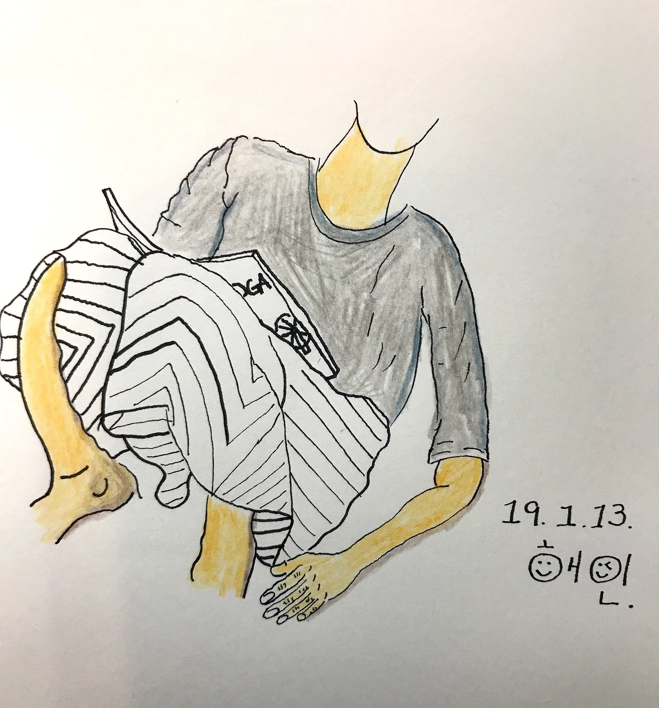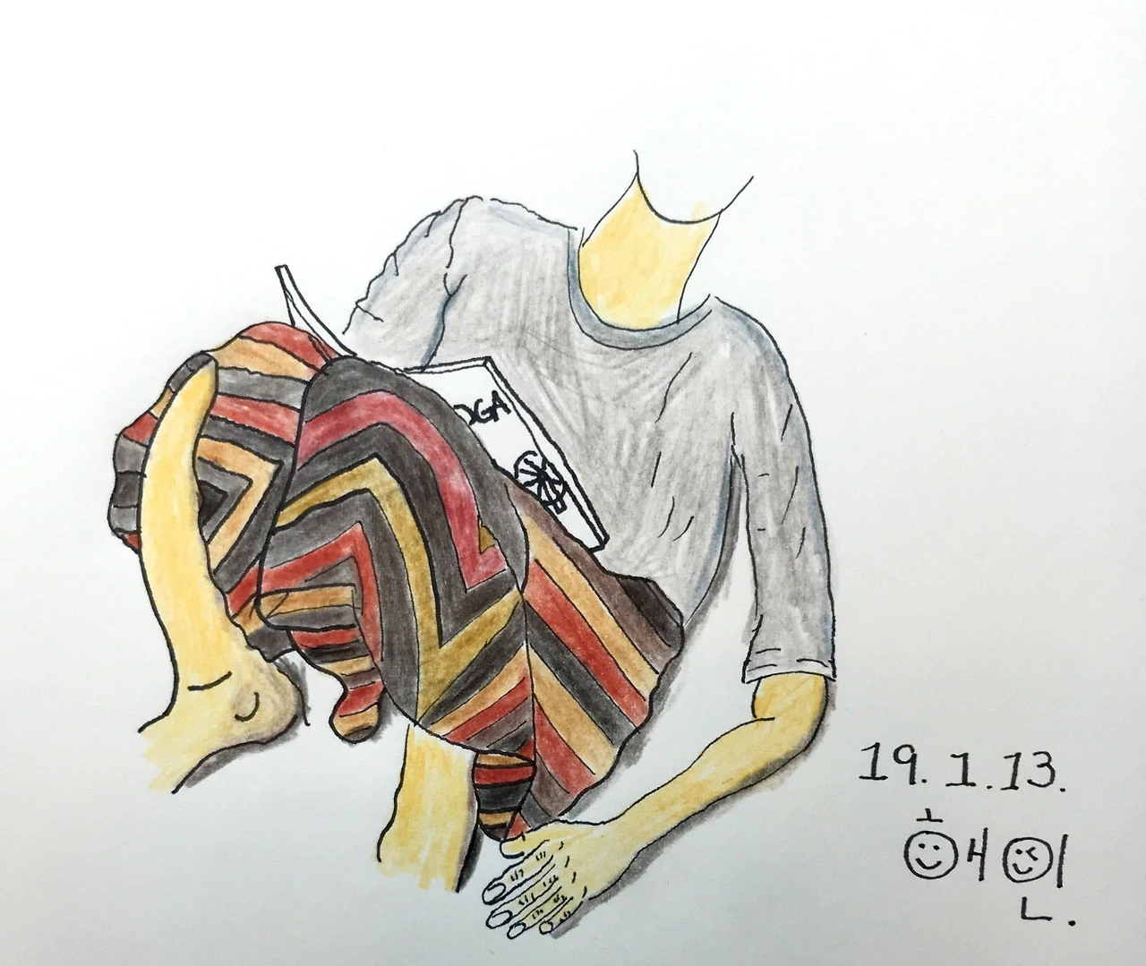 오늘의 주제는 옷이다. 무슨 옷을 그려야 되나 하는 고민을 하고 있는데 모임을 주재하신 분께서 그릴 것이 없으면 속옷이라도 그려보라는 말씀을 하셨다. 팬티를 그리기에는 너무 밋밋하지 않을까 하던 차에 옆에서 책을 읽고 있는 아내가 보였다. 특히나 그녀가 입은 정체모를 디자인의 치마인듯한 바지가 눈에 들어왔다.