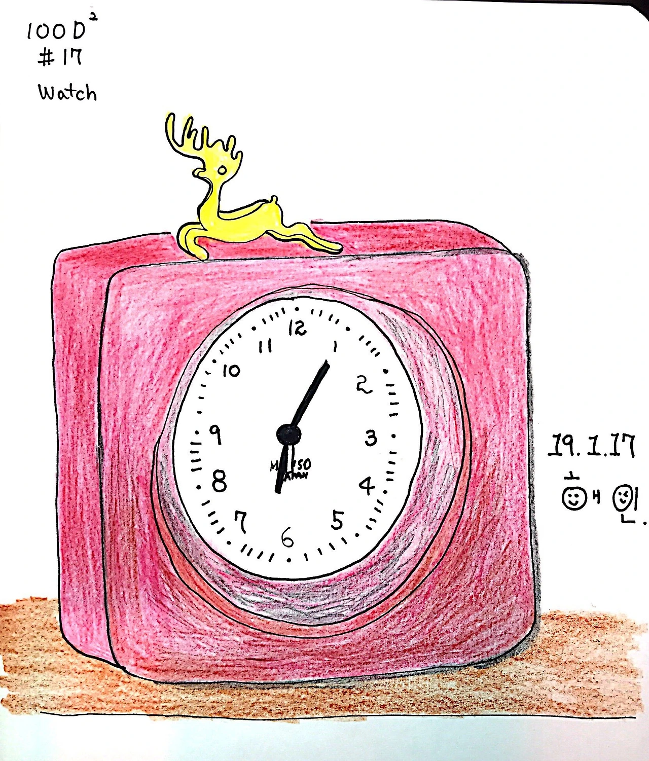 우리 집 책선반에 올려져 있는 작은 시계. 시계에 드리워진 그림자를 잘 살려보고 싶었는데 딱히 느낌이 안 산다. 황금빛이 나는 사슴 역시 샛노란 사슴으로 변했다. 진한 빨간색과 빛의 조화는 어딘가 모르게 따로 노는 느낌이다. 그렇지만 오늘도 나만의 그림을 그렸음에 만족하며 펜을 내려놓다.