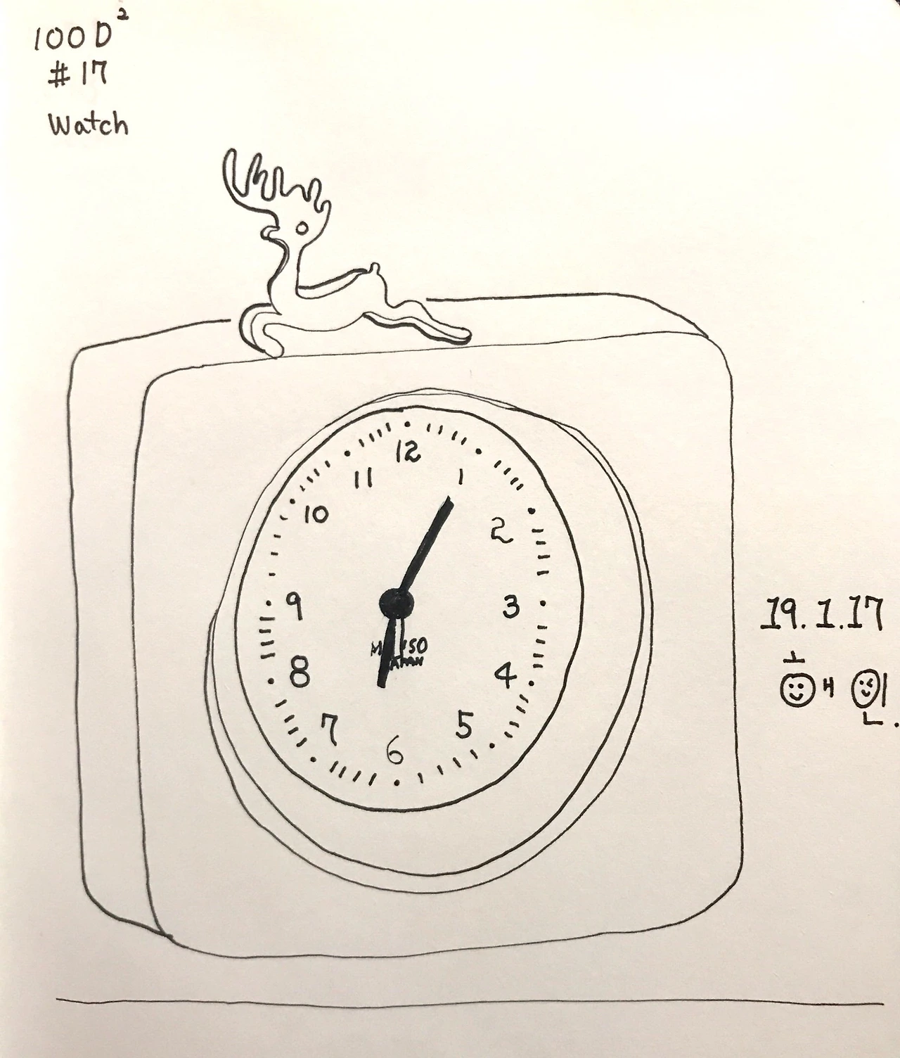 초간단 스케치를 모두 마쳤다. 원래 시계는 아무 장식도 없는 정확한 사각형이다. 그런데 너무 밋밋해 보여서 크리스마스 케이크에 썼던 사슴 한 마리를 떼어 왔다. 밑에 꽂았던 플라스틱 막대기는 부러트리고 시계 위에 금색 사슴만 올려놓았다. 뿔이 원래는 조금 빈약한데 그리다 보니 너무 부각되었다.
