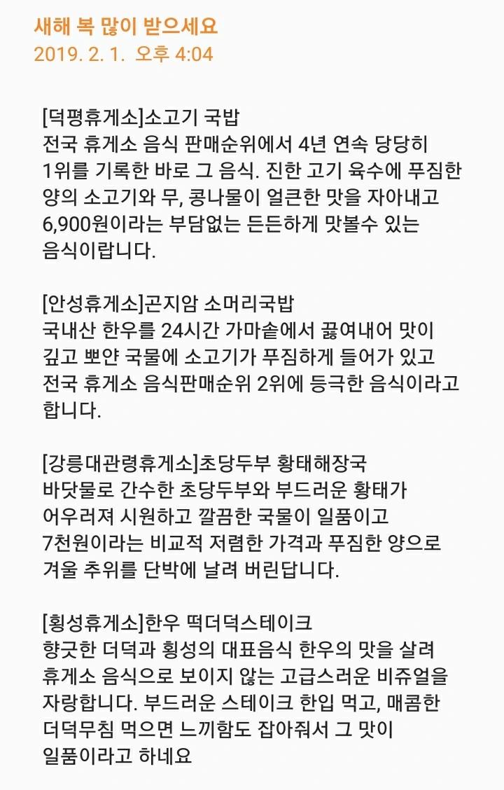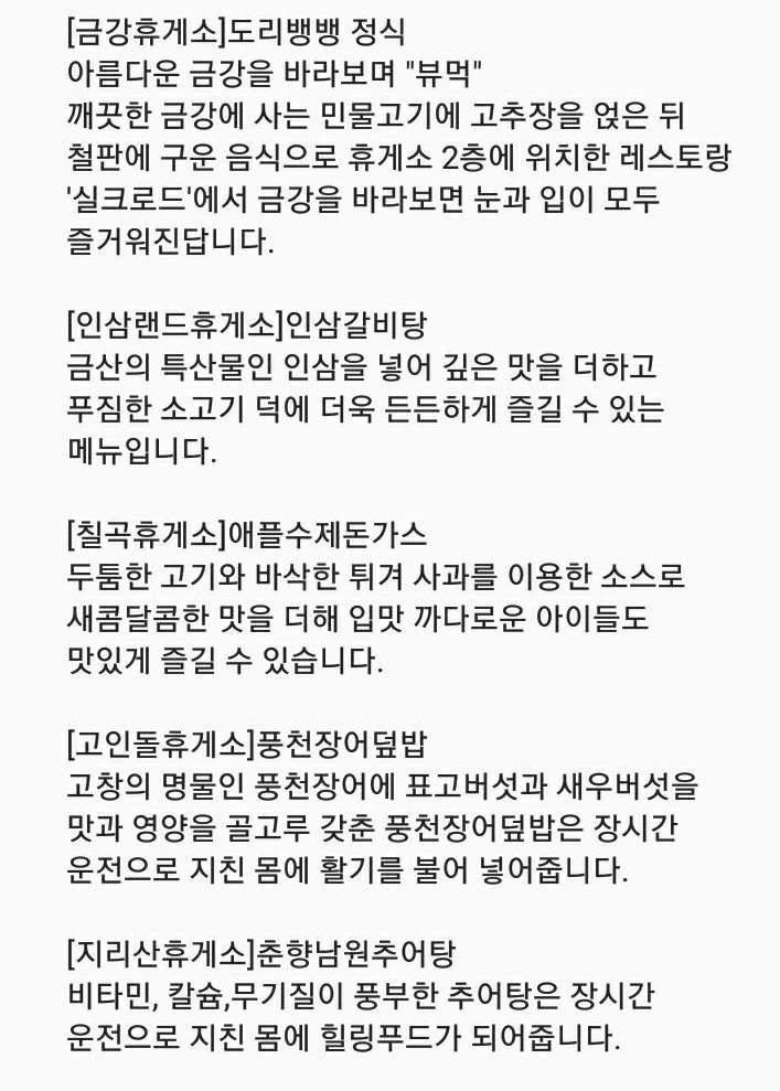 전국 휴게소 중에 유명한 음식점들을 가려서 문자에 담은 것이다.