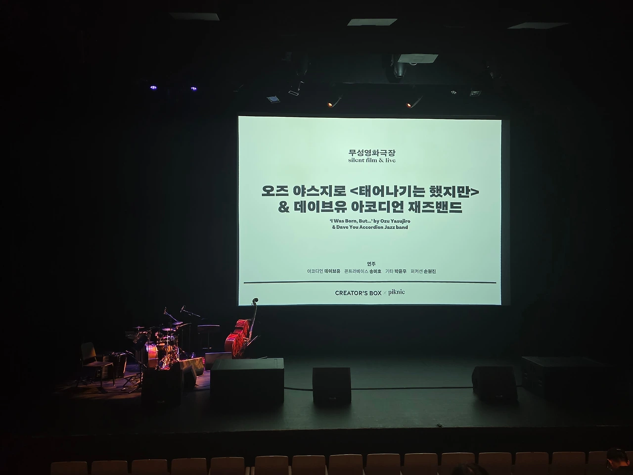 지난주 수요일 퇴근 후 LG아트센터에서 일본 영화계의 거장, 오즈 야스지로의 무성영화 <태어나기는 했지만>을 관람했습니다. 목소리가 없는 공백이 아코디언 밴드의 라이브 연주로 채워졌던 특별한 경험이었습니다.