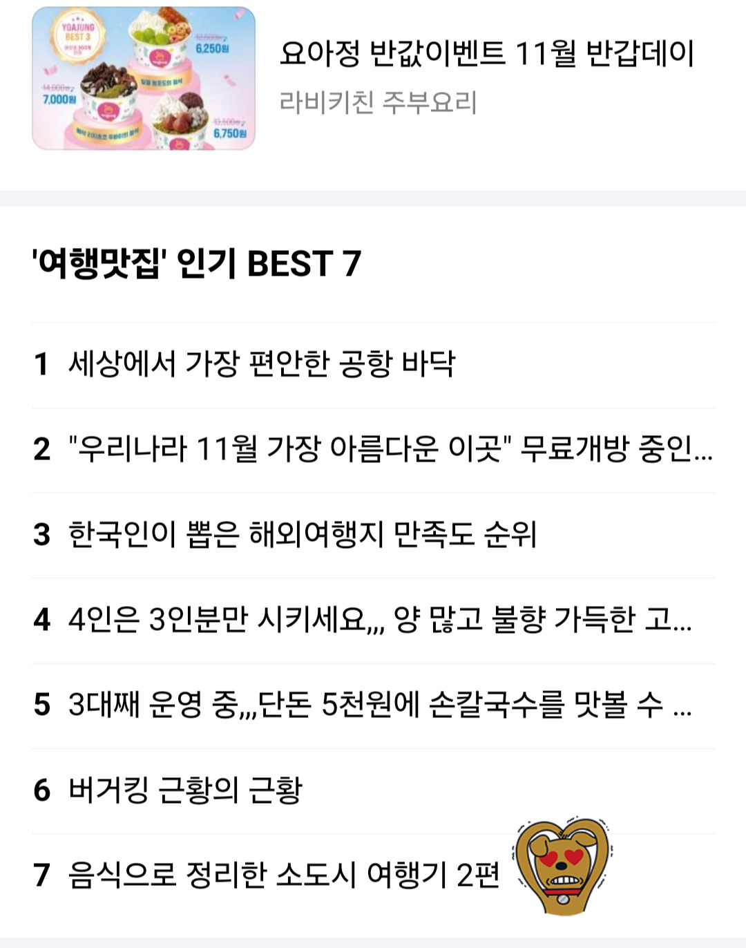 제 게시글 "음식으로 정리한 소도시 여행기 2편"이 다음 여행맛집 페이지에 메인으로 걸려있었습니다. 이쪽 메인에 걸려있다보니 하루만에 3천 조회수를 기록할 수 있었습니다. 이틀 정도가 지나가고도 조회수가 계속 오르길래 찾아보니,