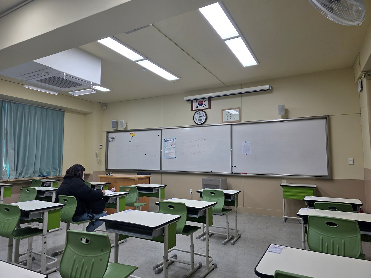 따닥따닥 붙어있는 중학교 교실과 책상이 참 정겹습니다. 책상은 여전히 참 좁다는 생각이 듭니다. 제가 생각하기에 시험장을 선택할 때 가장 중요한 요소는 바로 "스피커" 상태 입니다. 토익을 볼 때는 해커스토익 사이트에서 고사장 정보를 찾아보고, 거리가 좀 멀다라도 스피커 후기가 좋은 곳으로 원정을 떠나기도 하는데, 양동중학교는 정보가 없어서 좀 불안하기도 했지만 스피커 음향이 나쁘지 않았습니다.