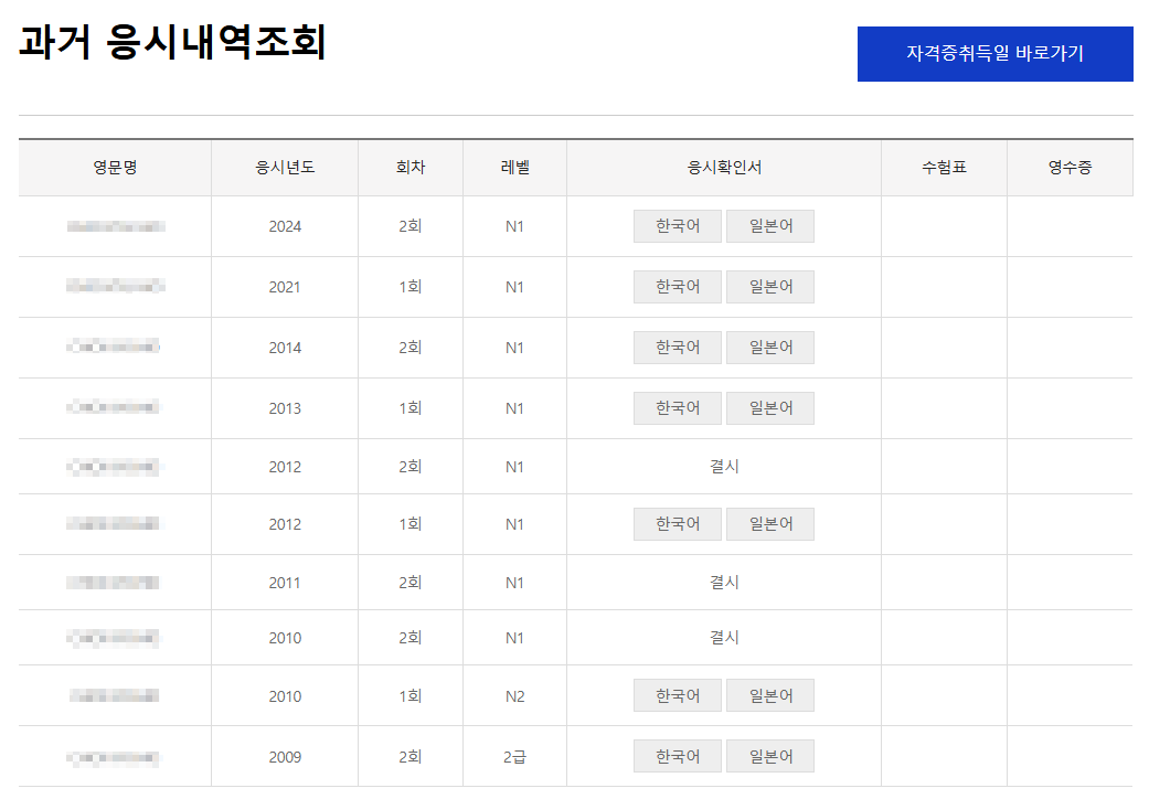 JLPT에서는 지금까지 응시했던 모든 내역을 확인할 수 있다 (점수 제외)