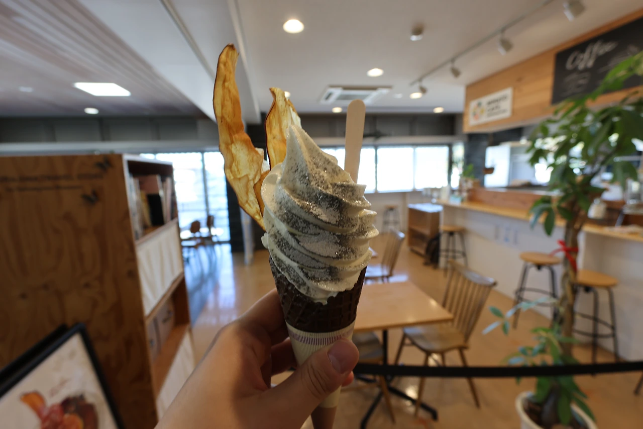 사쿠라지마에 도착하고 들뜬 마음으로 여행을 시작하는 대부분의 관광객들과는 달리 저는 졸음이 몰려와서 바로 길을 나서지 못했습니다. 관광안내소에서 버스 1일 패스를 사고 카페에서 잠시 쉬어가기로 합니다. 소프트 크림을 사먹었는데 무려 이름하여 "降灰 (화산재가 내리는) 소프트", 바닐라 아이스크림에 흑임자인지 회색 가루가 뿌려져있습니다. 모르긴 몰라도 화산이 폭발하는 모습을 튀긴 고구마 칩으로 표현한 것 같아 경악을 금치 못했습니다. 약점을 강점으로 승화하는 아이디어가 대단한 것 같습니다.