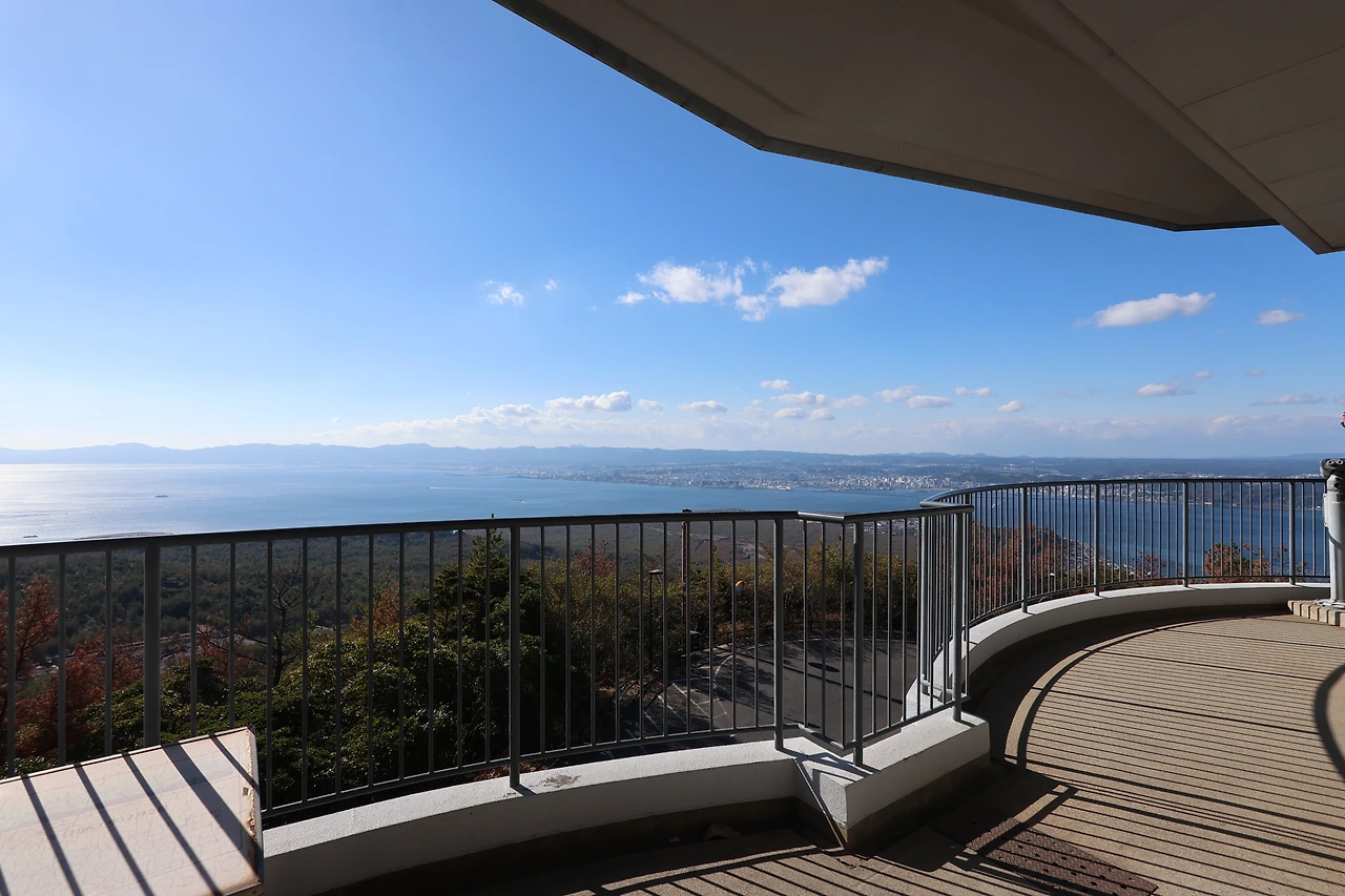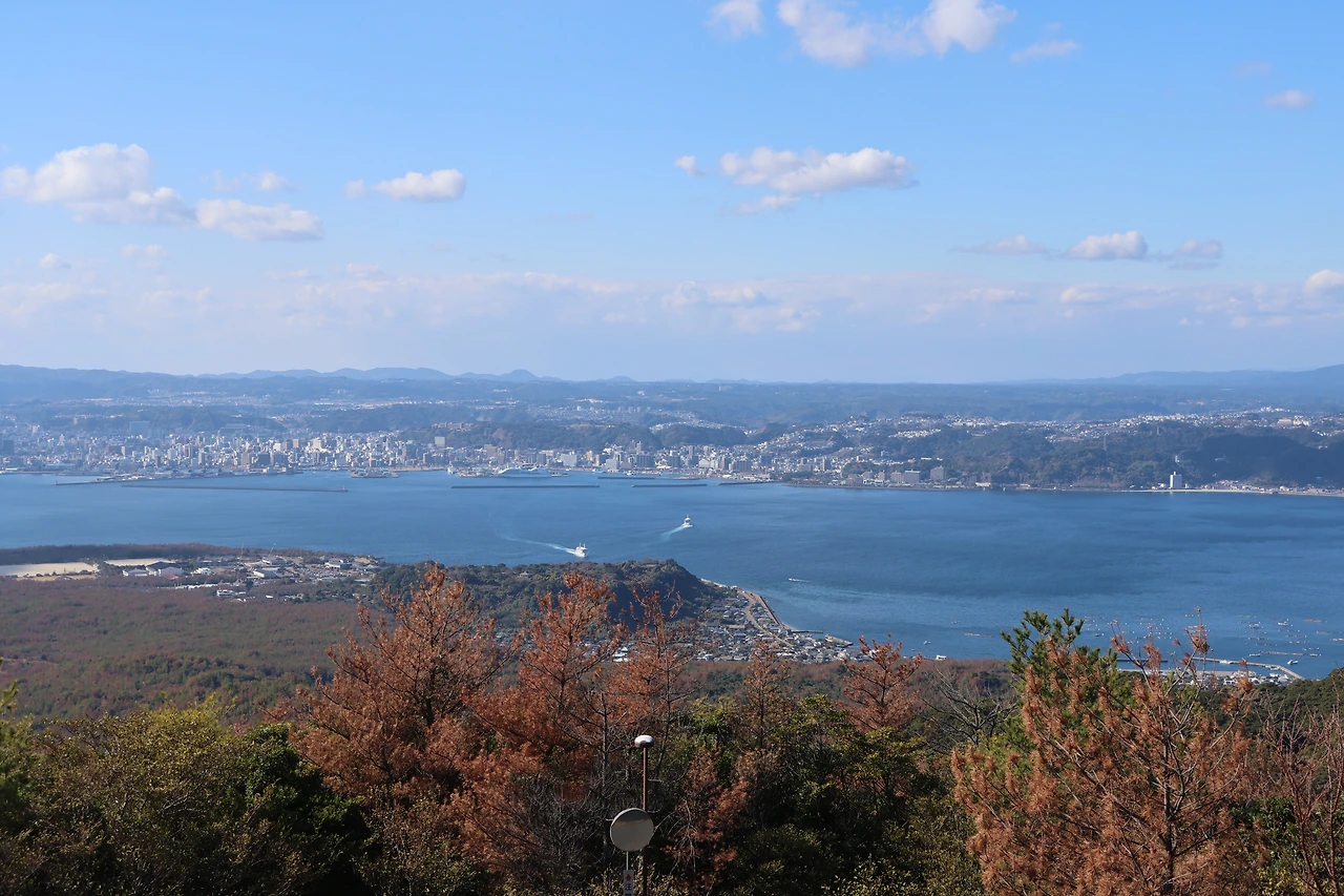그렇게 비지터센터 앞 정류장에서 버스를 타고 유노히라 전망대로 직행했습니다. 전망대에 올라보니 동서남북이 모든 방향이 아름다웠습니다. 뒤로는 사쿠라지마를 한층 더 가까운 위치에서 바라볼 수 있어서 좋았고, 서쪽으로는 가이몬다케 산이보이고, 전방으로는 푸른 바다와 함께 가고시마시로 오가는 페리도 보였습니다. 마음이 뻥뚫리는 느낌과 시원한 풍경이 좋았습니다.