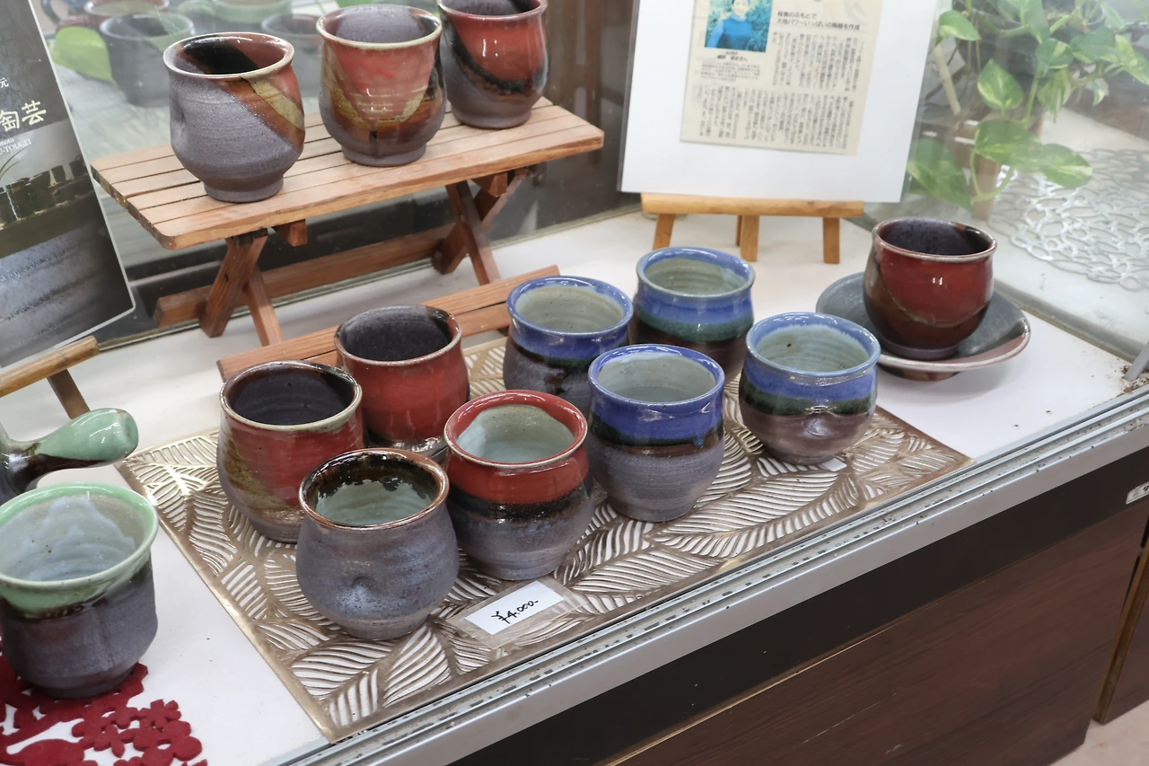 마지막으로 '오가쿠 토게이'라는 사쿠라지마의 가마에 도착했습니다. 이 가마를 창건한 사장님과 딸이 운영하는 가마였는데, 여기서도 왠걸 말을 계속 걸어주시고 반겨주셔서 몸둘 바를 몰랐습니다. 일본어를 너무 잘한다, 나도 한국에 예전에 많이 갔다 등등 사쿠라지마 화산재로 자기를 만들고 츠바키라는 꽃으로 파란색과 빨간색의 색감을 넣는다고 합니다. 절대 인터넷으로 판매하지 않고 이곳에 방문해야만 구입할 수 있다고 하여 자부심이 느꼈습니다. 차와 함께 사쿠라지마에서 유명한 무로 만든 무절임도 공짜로 주셔서 감사하게 마셨습니다. 화산재로 만든 컵은 확실히 색감이 탁하고 묵직한 느낌이 들었고 두어개 정도 구매했습니다.