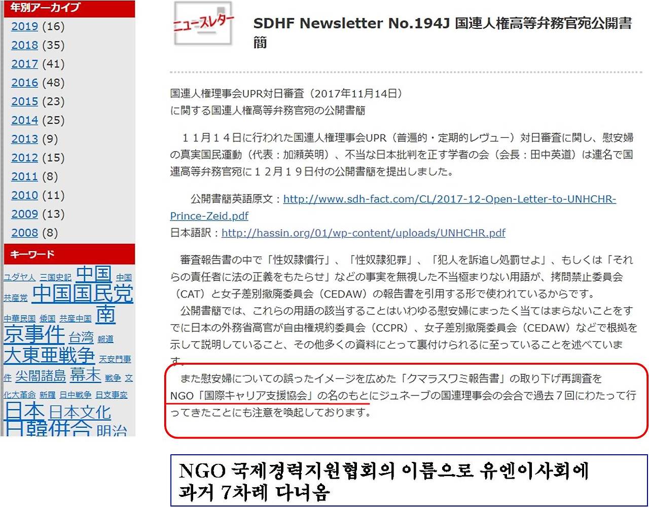 일본 우익들의 대(對) 유엔활동 창구, <국제경력지원협회>. 이들을 막을 수는 없는 걸까? 양보하여 NGO로서 다른 NGO의 입장을 대변해줄 수 있다손 치더라도 그들은 정관에 기재된 자신들의 활동 목적, 영역과는 전혀 상반되는 분야에서 활동하고 있으며 그 행태 또한 다분히 편법적이다. 정작 '국제 경력'과 관련된 활동은 하지 않고 일본 우익단체들이 유엔에 어떤 발언을 하고 싶을 때 '특수자문자격'으로 망언의 교두보가 되고 있는 것이다.