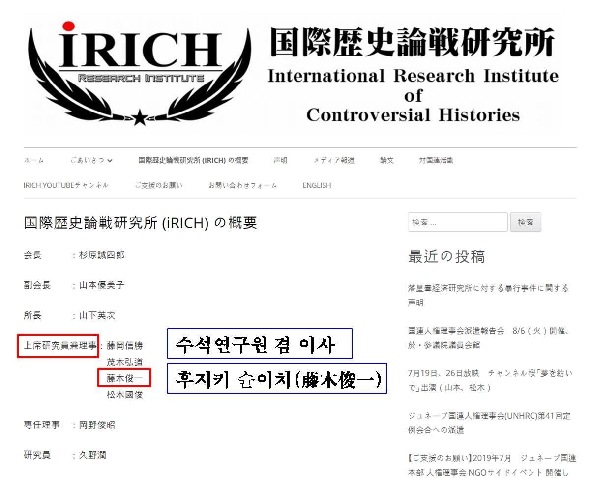 이에 필자는 이 연구위원이 직접 언급한 '일본역사논전연구소'와 극우인사 '후지키 슌이치'와의 연관성을 알아보고 이러한 국제여론전을 펼치는 <국제경력지원협회>의 실체에 대해 조사해봤다.
