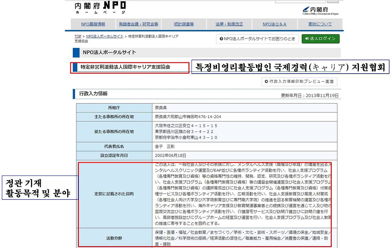 먼저 이야기해야 할 것은 <국제경력지원협회>라는 단체의 성격이다. <국제경력지원협회>는 2002년 '가네코 마사노리'라는 인물에 의해 '특정 비영리활동법인'으로 설립됐다. 이후 2015년 '일반 사단법인'으로 변경, 현재에 이르고 있다.