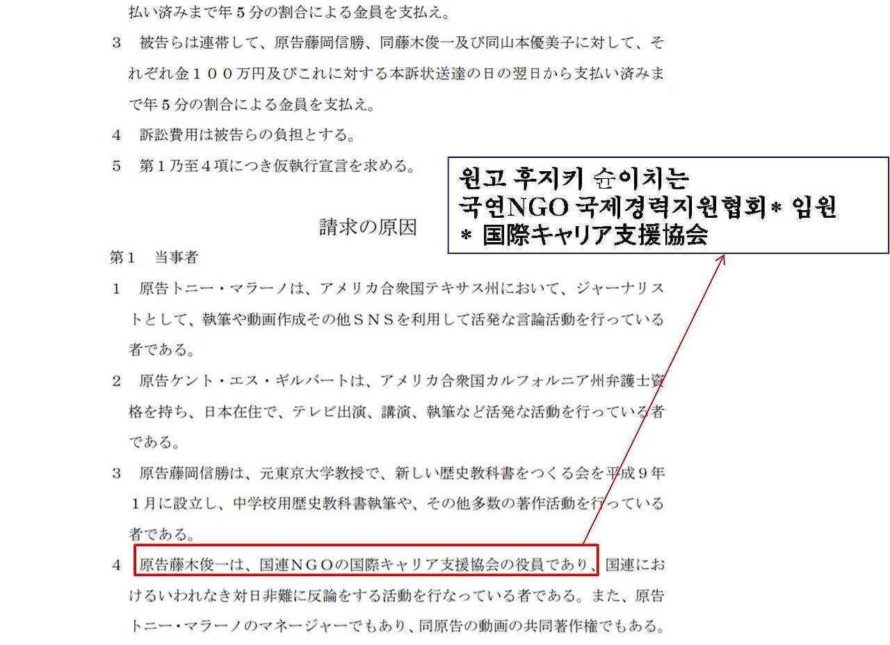 공교롭게도 '후지키 슌이치'라는 극우 인사는 <국제경력지원협회>의 '임원'인 동시에 <국제논전연구소>의 '수석연구원 겸 이사'로 등재돼 있다. 즉, '후지키 슌이치'는 양 단체에 모두에 임원급 직위를 가지고 있는 인물로 <국제논전연구소>의 심포지엄과 <국제경력지원협회>의 유엔 발표에 모두 관여해온 것으로 볼 수 있다.