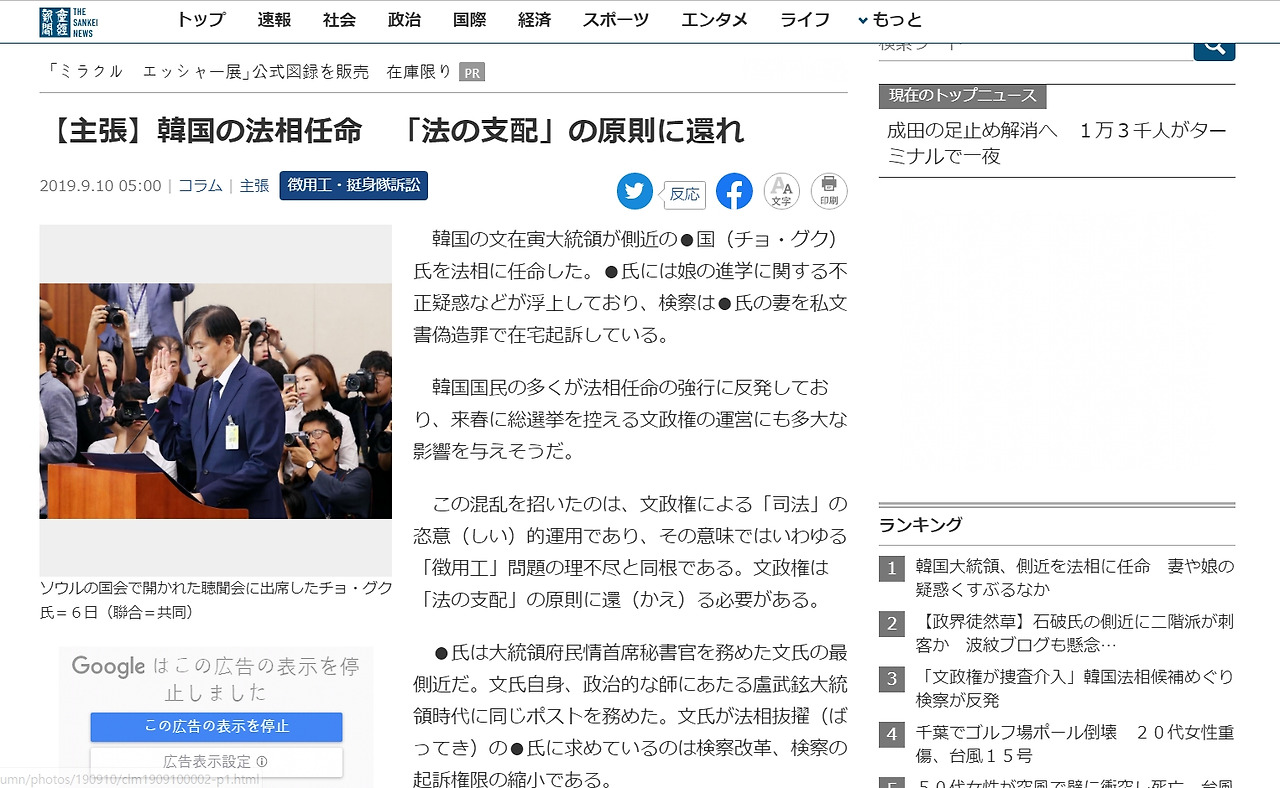 조국 법무부 장관 임명에 따른 국내 여론의 이목이 집중되고 있는 가운데, 일본에서는 <산케이 신문>이 이에 대한 비상한 관심을 나타내며 비판에 가세하고 있다. 10일, <산케이 신문>은 '한국의 법무부 장관 임명, 「법의 지배」 원칙으로 돌아가라'라는 제목의 사설을 통해 삼권분립에 의한 한국의 법치 체계와 대통령의 인사권 등에 대해 비판했다.