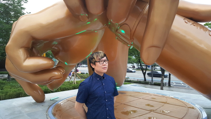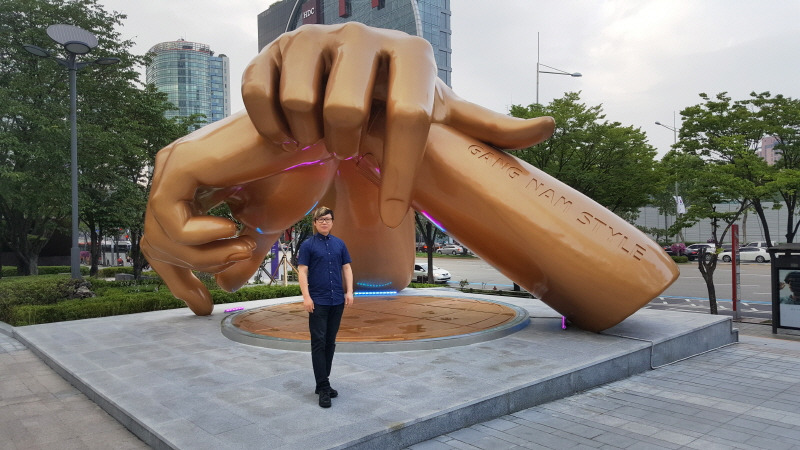 저를 소개하기 가장 쉬운 작품은 아마 코엑스에 전시되어 있는 강남스타일 동상이 아닐까 합니다. 강남스타일 스토리텔링 랜드마크는 세계 32억 명 이상이 유투부를 통해 열광했던 싸이의 ‘강남스타일’ 뮤직비디오 영상에 나오는 ‘말춤’의 손동작을 모티브로 인터렉티브 하게 제작했습니다. 실제 뮤직비디오의 촬영지였던 코엑스 앞에 설치해 강남을 찾는 세계인의 소통과 공유를 위해 재능기부 형식으로 제작한 작품입니다.
