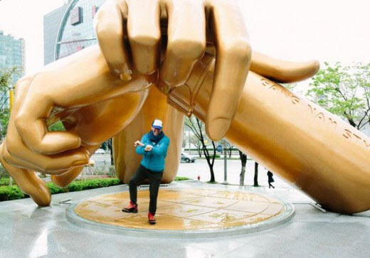 세계적인 스타 Coldplay가 한국에서 찍은 두 장의 사진 중 한 장이 바로 강남스타일 동상 앞에서였다. 나머지 한 장은 자신의 공연이 열렸던 잠실 올림픽 주경기장 앞에서였다.