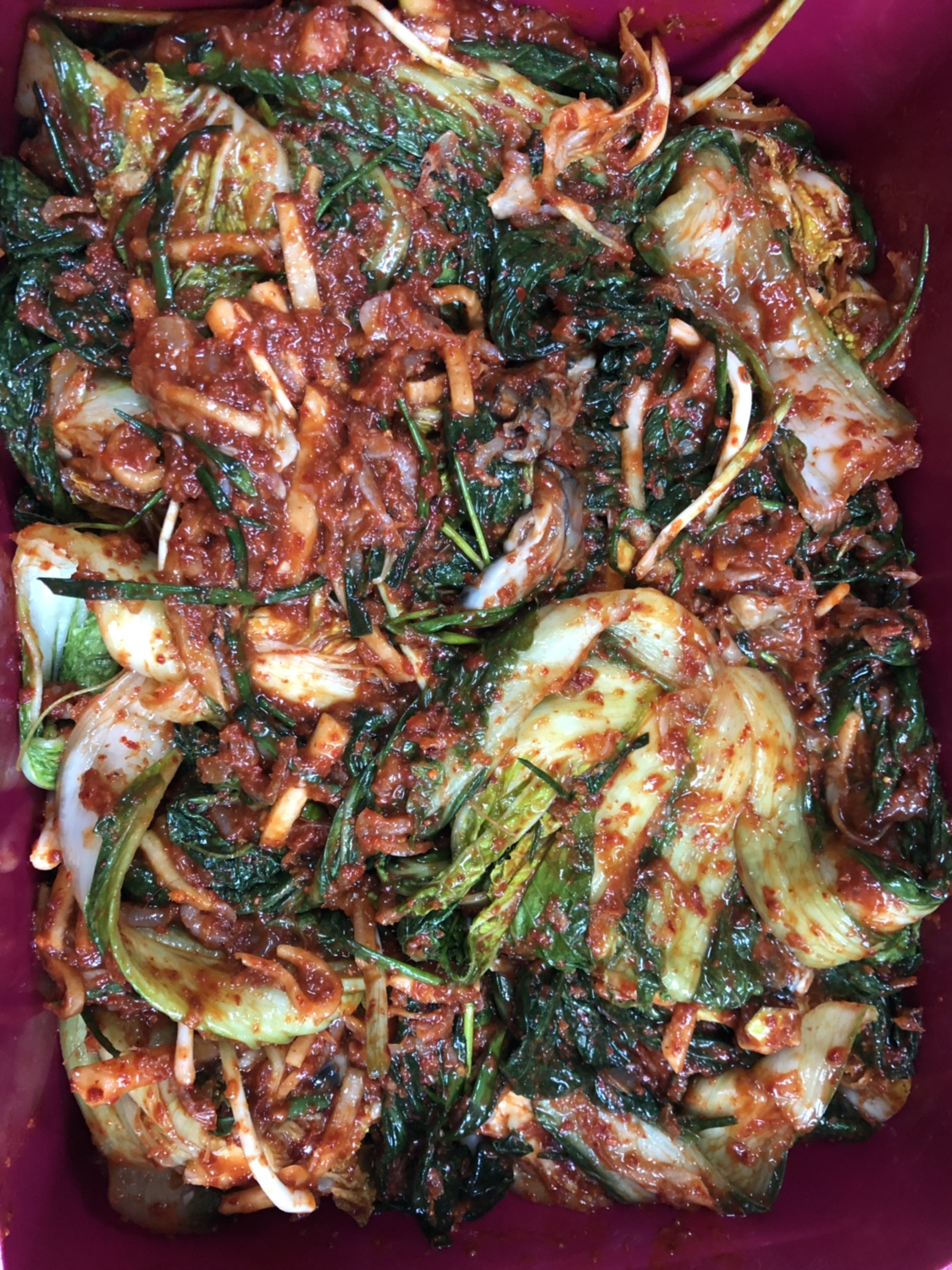소금을 뿌려 둔 배추는 늦은 밤까지 숨이 죽지 않았다. 그냥 겉절이를 해야 하나 싶을 정도로 끈질기게 생생함을 유지했다. 잠시 고민하다가 커다란 대야에 고농도의 소금물을 만든 다음, 녀석들을 집어넣었다. 소금물에 잘 섞어 시간을 조금 보내니 그제야 숨이 죽기 시작했다. 그대로, 아침까지 두었다. 일요일 아침 일찍 나가보니 숨은 완전히 죽어 부피가 3분의 일 수준으로 줄어있었다. 바로 꺼내어서 물에 세 번 정도 씻었다. 대야를 뒤집어 씻은 배추들을 널듯 올리고 물을 뺐다. 절이는 시간은 적절했는지, 잘 씻은 것인지, 그리고 배추의 염도는 괜찮은지 아무런 감이 없었다. 다만, 잘 절여졌을 거라는 막연함만 존재했다.