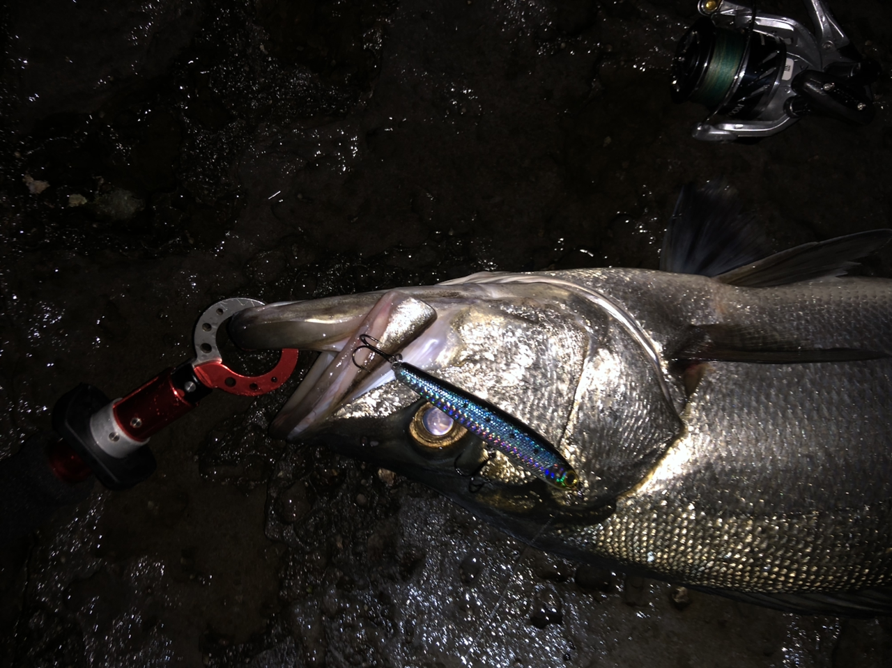 아쉬워할 틈이 없었다. 긴장으로 팽팽해진 내 폐와 어깨가 캐스팅하는 내 팔에 통증을 느끼게 할 정도로 힘을 전달했다. 내가 선 포인트는 이제 파도가 몰려오면 물에 살짝 잠기고 있었다. 그러나, 위치와 여건이 너무 좋아서 물러날 수 없었다. 그렇게 30여 분을 한 자리에서 쉬지 않고 대를 열심히 던졌다. 만조까지는 30여 분이 남았고, 나에게는 그 시간만큼의 기회만 남았다는 절박감까지 얹혔다. 물은 거의 다 올라왔을 텐데도, 파도가 올라오면 내 발목까지 포인트가 잠기곤 했다. 아, 제발.. 하는 절박과 긴장이 뒤섞이는 찰나였다. 캐스팅 후 착지한 미노우가 릴에 끌려 바로 내 앞에서 들어 올려질 찰나, 물속에서 무언가가 펄쩍 뛰더니 퍽! 하고는 커다란 입으로 미노우를 낚아챘다. 동시에 찌이익~ 하고 드랙이 풀려나갔다. 녀석이 미노우를 물고 십 수 미터를 도망가더니 갑자기 수면 위로 튀어올라 몸부림을 쳤다. 아! 넙치 농어다!라고 느끼는 순간 나는 허리를 낮추고 대를 옆으로 낮게 유지했다. 다리엔 힘이 배로 들어갔다. 넙치 농어는 수면 위에서 몸을 털며 바늘에서 벗어나려는 습성이 있다. 그래서 대를 높게 세워 유지하면 장력에 의해 털릴 가능성이 있다. 대를 최대한 낮추고 장력의 피해를 최소화하는 것이 넙치농어를 낚을 때의 요령이다. 게다가 녀석은 보통의 농어보다 힘이 좋았다. 일반 농어는 물속에서 힘 있게 채비를 물고 도망가기를 몇 번 반복하다 물속에서 퍼져버리는데, 넙치농어는 도망다가 끌려오다가를 반복하고 수면 위에서 바늘털이를 수시로 하는데도 좀처럼 지치지 않았다. 녀석의 습성에 따라 몸과 채비를 낮추어 장력을 유지하고, 드랙을 최대한 풀어두어 쉽게 바늘이 빠지지 않게끔 해 두니 녀석을 내 앞으로 끌어내는 일이 만만치 않았다. 녀석은 십 수미터를 도망가다가 다시 끌려오다가 어느 즈음에서 수면으로 튀어 바늘털기를 여러 번 반복했다. 녀석은 지치지 않았고, 나는 서서히 지쳐갔다. 대를 팔꿈치에 붙이고 버티는 오른팔에는 힘이 무척 들어가며 아프기 시작했다. 누가 더 오래 버티는가의 싸움이 긴장 속에서 벌어졌다. 15분 이상을 그렇게 겨루었고, 포인트는 이제 파도가 올라오면 발목 위로 꽤 깊이 잠겨가고 있었다. 힘주어 버티는 하체가 어둠 속의 울퉁불퉁한 바위 위에서 이동을 어렵게 했다. 그냥 그 자리에서 녀석을 끌어낼 때까지 버텨야 했다. 녀석의 크기도 가늠할 수 없이 그렇게 버텼다. 그러다 보니 녀석의 바늘털이가 뜸해졌다. 내 발 밑에서 다시 도망가기를 두어 번 정도 반복했다. 그러다, 발 밑에서 마지막이다 싶을 힘 빠진 바늘털이를 하더니 갯바위를 올라오는 파도에 힘없이 실려 내가 선 자리까지 다가왔다. 다시 파도가 밀려가자 녀석은 물이 빠진 검은 바위 위에 몸을 누이고 아가미를 가쁘게 움직였다. 랜턴을 켜고 나는 갸프를 꺼내 녀석의 아래턱을 걸어낸 뒤, 파도가 밀려들지 않는 안전한 위치까지 이동했다.