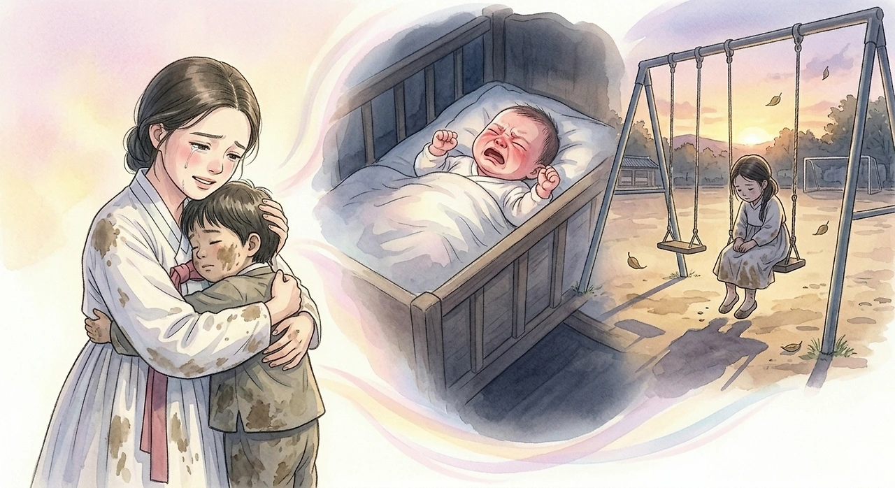 그 순간 연이의 눈앞에는 아무도 없는 방에서 홀로 울다 지쳐 잠든 한 살배기 연이가 보였습니다.