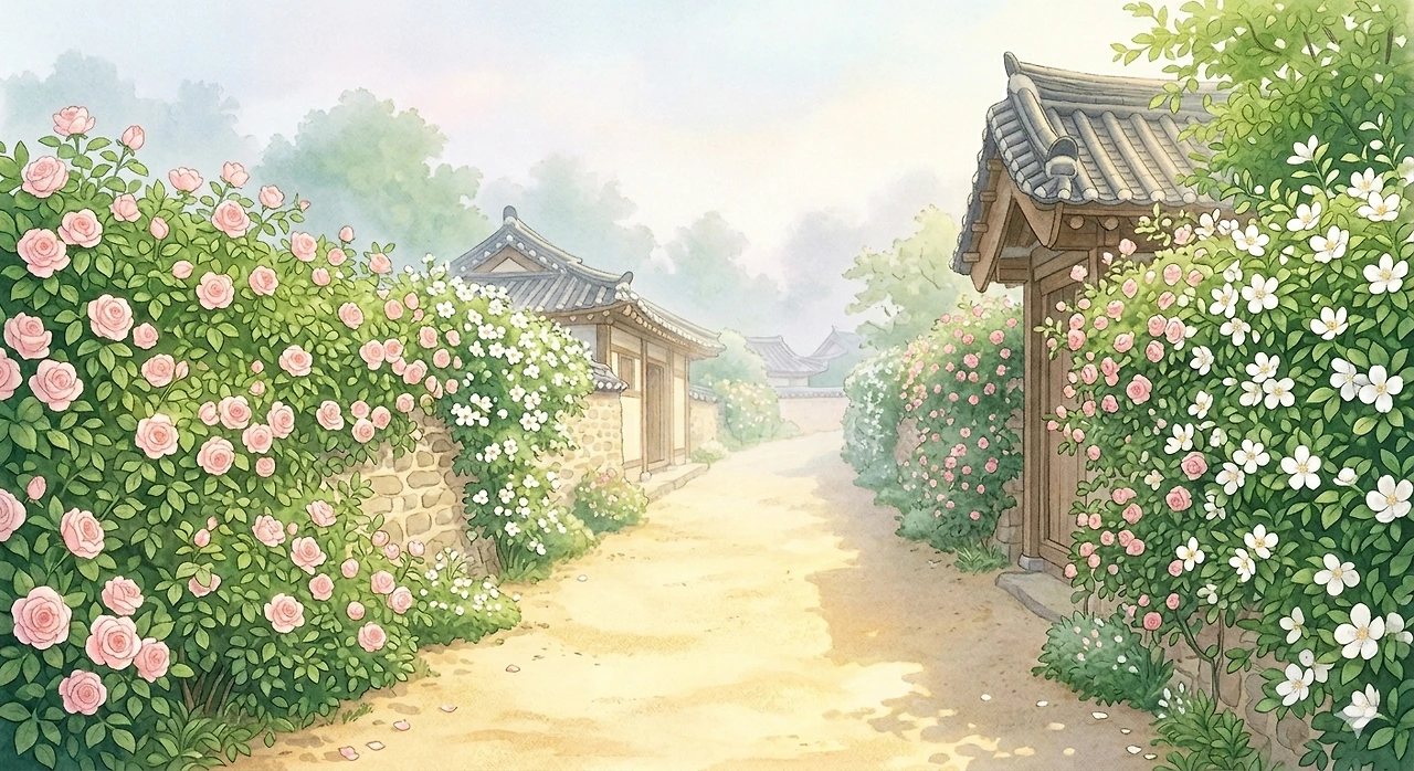 담장마다 싱그러운 초록 잎을 머금은 연분홍색 장미와 하얀 꽃송이가 가득히 피어난 곳.