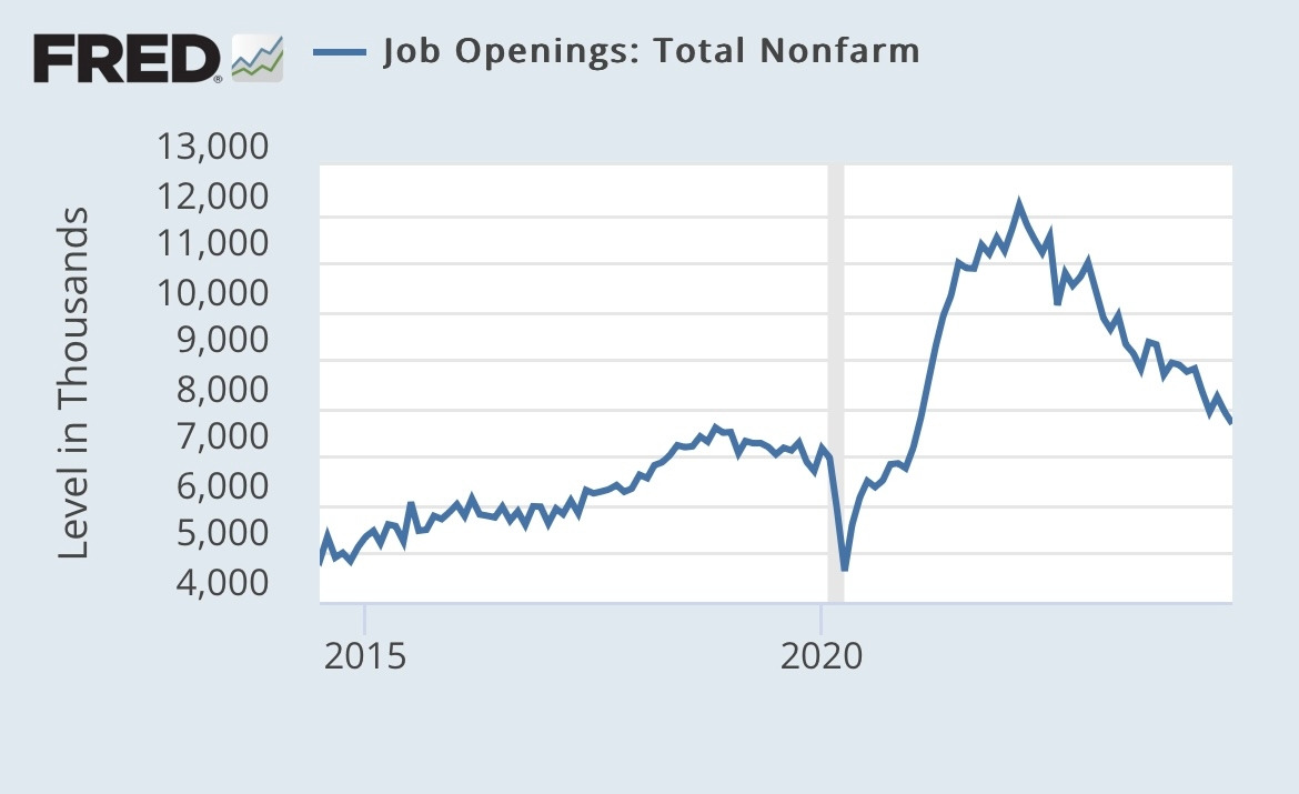 JOLTs 구인건수를 보자. 지금 이미 코로나19 이전 수준까지 구인건수가 내려왔다. 우하향 추세가 지속되고 있어 브레이크가 필요한 상황이다. 연준이 우려하는 부분이지 않을까 싶다.