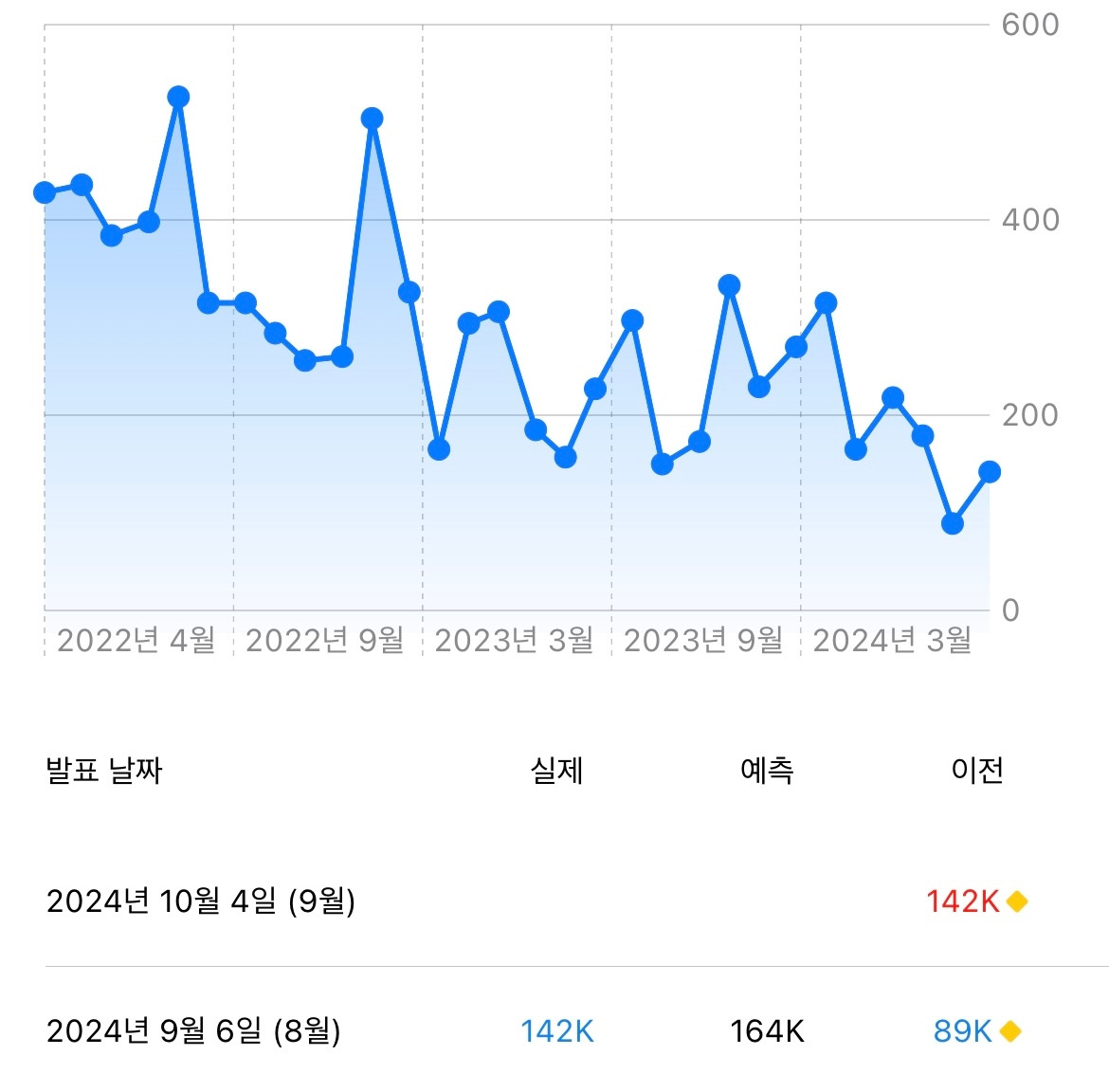 비농업고용지수 또한 마찬가지이다. 10만 명 고용이 이상적인 수치라고 하는데, 8월 고용은 89K에 그쳤다. JOLTs 구인건수와 마찬가지로 지금보다 더 내려가면 우려스러운 수준이다.