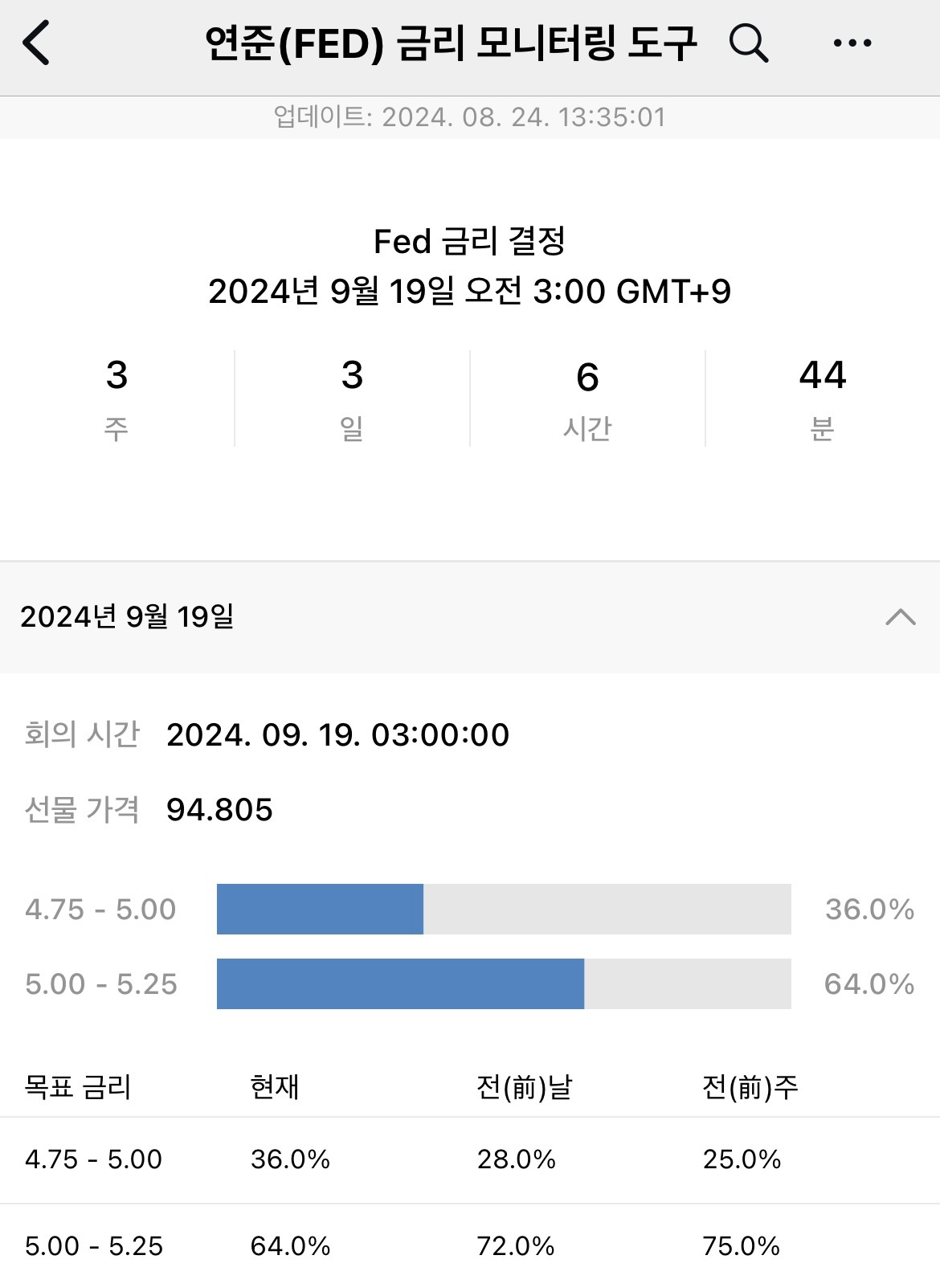 9월 19일로 예정된 FOMC 미국 금리 예상치를 볼 수 있는 FED Watch를 살펴보면, 25bp 인하 64%, 50bp 인하 36%로 나온다. 25bp 인하가 확률이 여전히 높지만, 50bp 인하를 예상하고, 또 그렇게 해야 한다는 사람들의 스피커가 아직 사그라들지 않고 있다. 내가 볼 때는 무조건 25bp 인하를 할 거 같고, 또 그렇게 생각하며 다가올 FOMC를 준비할 것이다.