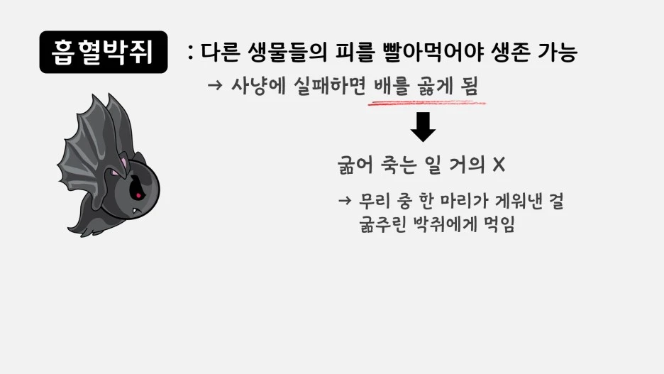 이타적인 행동은 동물의 세계에서도 심심찮게 발견되곤 합니다. 그 대표적인 예로 흡혈박쥐를 빼놓을 수 없는데요. 이름만 봐도 알 수 있듯 그들은 다른 생물들의 피를 빨아먹고 살아가는 동물입니다. 따라서 사냥에 성공하지 못한 흡혈박쥐들은 피를 구하지 못하여 배를 곯을 수밖에 없죠. 하지만 흥미롭게도 그들이 굶은 상태로 죽어가는 일은 좀처럼 발생하지 않습니다. 만약 그들이 굶주린다면 무리 중 한 마리가 그들에게 다가가 굶주린 박쥐에게 먹일 피를 토해내기 때문입니다. 대체 우리는 그들의 이타성을 어떻게 받아들여야 할까요?