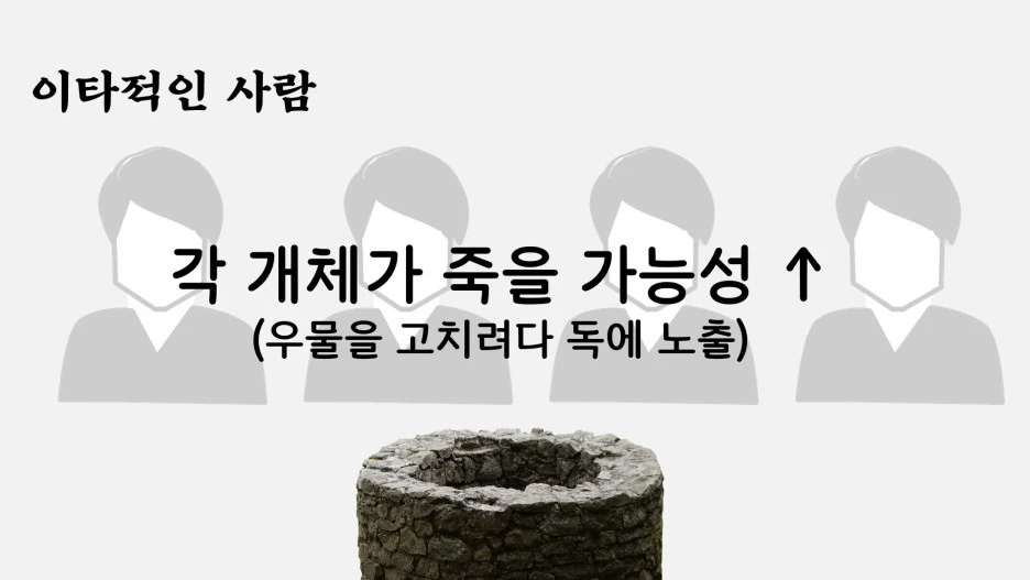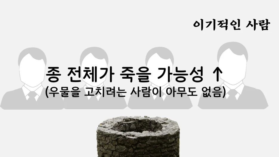 반면 이기적인 사람들은 나서지 않고 숨어 있다가, 나중에 우물이 정상적으로 회복된 뒤에야 슬그머니 나타나 조용히 우물을 사용할 지 모르죠.