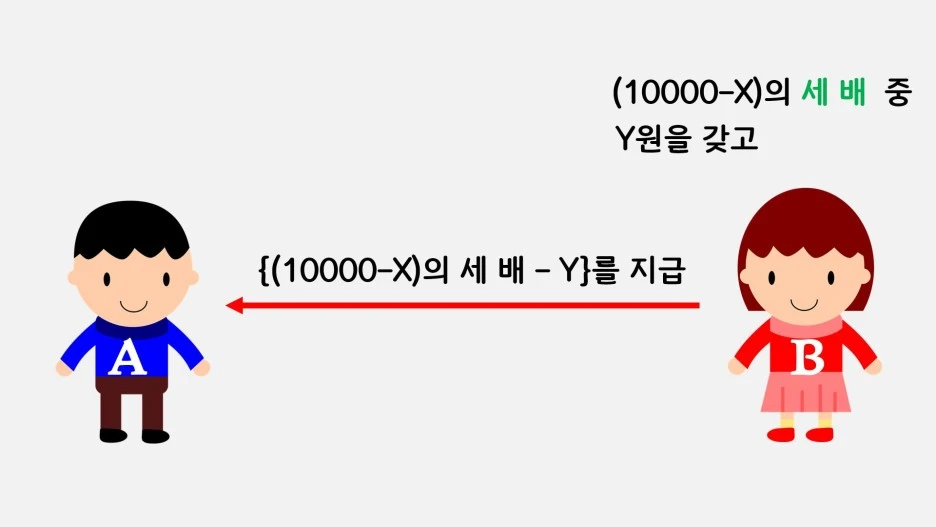 그렇다면 이번엔 실험의 규칙을 조금 바꿔보겠습니다. 이번에도 A는 실험진으로부터 만 원을 지급받고요. 다만 A가 B에게 건네는 돈은 B에게로 갔을 때 세 배로 증식합니다. 그리고 B는 그 중 원하는 만큼을 취하고 남은 액수를 A에게 돌려줄 수 있죠.