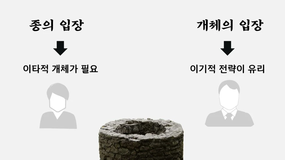 즉 이타적인 사람들은 늘 타인을 위해 헌신하느라 정작 본인은 목숨을 잃기 쉬운 반면 이에 반해 이기적인 사람은 위험한 일에 나서지 않음으로써 생존에 탁월한 능력을 발휘할 수 있는 것입니다. 따라서 마을에 모두 이타적인 사람만 있다면 그들은 자신의 목숨을 소홀히 여겨 죽게 될 지 모르고요, 반대로 마을에 모두 이기적인 사람만 있다면 아무도 우물을 손보지 않아 목말라 죽을 지 모릅니다. 이를 통해 우리가 알 수 있는 사실은 개체의 입장에선 이기적인 전략이 생존에 유리하지만, 종 전체의 관점으로 볼 땐 이타적인 사람이 반드시 필요하다는 사실입니다.