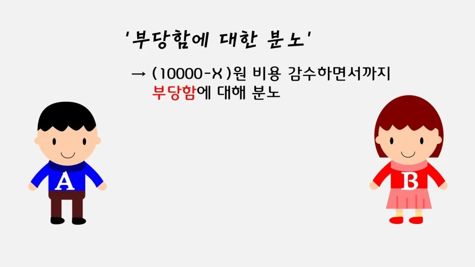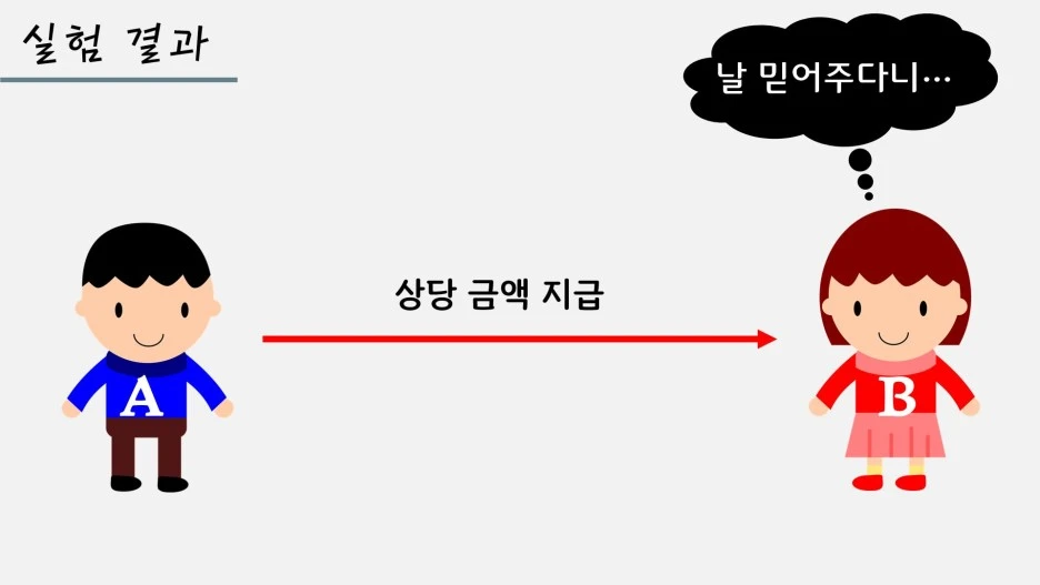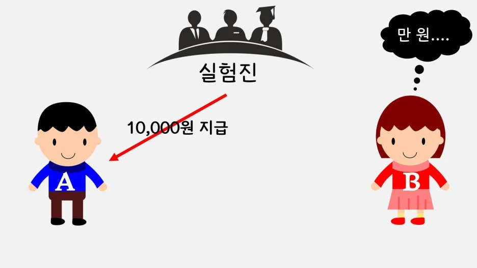 저자는 이 같은 주장에 설득력을 더하고자 한 실험 결과를 제시합니다. 실험 방법은 단순합니다. 실험 참여자는 A와 B, 두 명입니다. 실험진은 A에게만 만 원을 지급하며, B는 그 장면을 그대로 목격합니다.
