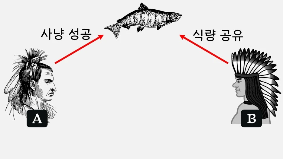 반복-호혜성 이론이란 서로 간에 베푸는 이타적 행위가 실은 대가를 바라고 행해지는 것이라 설명하는 이론입니다. 생물학자들이 관찰한 바에 따르면 굶주린 흡혈박쥐 B가 배부른 A로부터 도움을 받은 경우 다음번에 B는 거꾸로 A가 굶주릴 때 다가가 도움을 준다고 합니다. 즉 A와 B가 서로에게 베푸는 이타성은 순수한 의미에서의 이타적 행위가 아니라 그저 생존을 위해 맺은 전략적 거래라 할 수 있죠. 다만 여기서 중요한 점은 이번에 내가 상대방을 도왔다면 나중에 상대방은 꼭 나에게 대가를 치뤄야 한다는 것입니다. 따라서 A와 B가 하루만 보고 말 사이라면 상대가 굶고 있더라도 굳이 도울 이유가 없다는 말이죠. 즉 반복-호혜성 이론이란 내가 상대를 도왔을 때, 그에 대해 상대방도 나를 도울 가능성이 충분할 때만 서로가 이타적 행위를 베푼다는 논리입니다. 하지만 이 또한 모든 종류의 이타적 행위를 완벽하게 설명해주지는 못합니다. 이를테면 아프리카의 한 원주민 집단에서 발견되는 식량 공유 풍습을 예로 들어볼까요? 저자에 따르면 이들 부족은 사냥에 성공한 이들이 가져온 식량을 모두가 공유한다고 합니다. 쉽게 말해 원주민 A가 사냥하여 얻은 식량을 집에서 놀던 B도 같이 먹는다는 거죠. 다만 흥미로운 점은 그들의 역할이 바뀌지 않는다는 것입니다. 다시 말해 A는 자신의 식량을 내놓으며 집단과 공유하지만 이 때 B는 먹기만 할 뿐 시간이 지나도 A에게 대가를 지불하지 않는다는 것입니다. 따라서 반복-호혜성 이론은 대가가 치뤄지지 않는 이타적 행동을 설명해주지 못합니다.