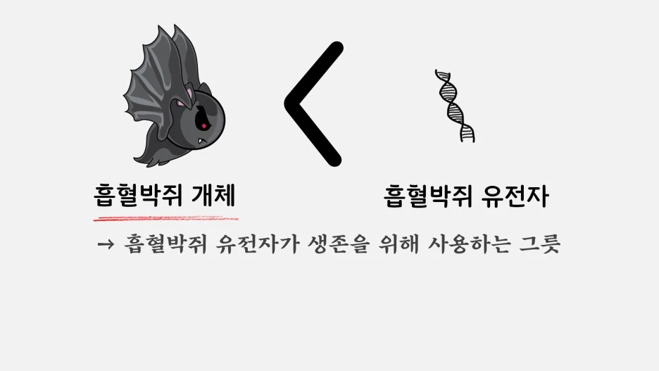 이에 대한 대표적인 설명 중 하나는 도킨스를 비롯한 여러 생물학자들이 주장하는 혈연선택이론입니다. 도킨스는 개체라는 것이 단지 유전자가 자기를 보존하기 위해 사용하는 그릇에 지나지 않는다고 이야기했죠. 쉽게 말해 흡혈 박쥐 한 마리 보다 중요한 것은 그 안에 담겨 있는 유전자라는 사실, 다시 말해 흡혈박쥐의 몸뚱이는 흡혈박쥐 유전자가 살아남기 위해 사용한 그릇일 뿐이라는 이야기입니다.
