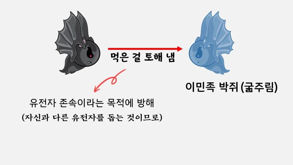이러한 도킨스의 관점에서 흡혈박쥐들의 이타성을 설명한다면, 그들이 서로 굶주린 박쥐를 도우려는 행동은 남을 위한 이타성 때문이 아니라, 단지 그들의 유전자가 줄어들지 않길 바라는 보존 본능 때문이라고 이해할 수 있죠. 하지만 아쉽게도 이러한 도킨스의 설명은 흡혈박쥐들의 이타성을 온전히 설명해줄 수 없습니다. 왜냐하면 흡혈박쥐들은 그들 무리에 나중에 끼어든 박쥐들, 이른바 이민족 흡혈박쥐들이 굶주렸을 때에도 동일한 이타성을 발휘하기 때문이죠. 만약 도킨스의 말 대로 흡혈박쥐가 단지 이기적 유전자의 생존기계에 지나지 않는다면 그들이 자기와는 전혀 다른 유전자를 지닌 이민족 흡혈박쥐를 돕는 것은 오히려 생존에 방해가 될 지도 모릅니다.