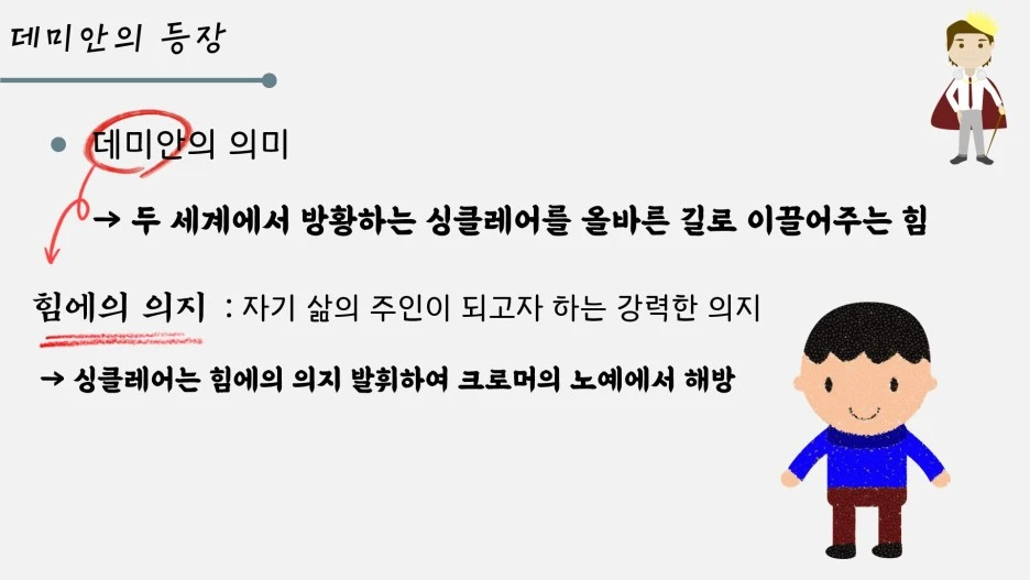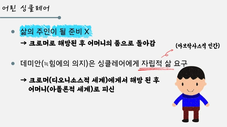 쉽게 말해 데미안(힘에의 의지)은 싱클레어가 자기 삶의 주인으로 살아가는 자립적 인간, 즉 두 세계를 뛰어넘은 아브락사스적 인간이 되길 소망했지만, 어린 싱클레어는 기껏 디오니소스적 세계(크로머)로부터 해방되자마자 다시 익숙한 아폴론적 세계(따뜻한 가정)로 피신했을 뿐입니다. 아직 싱클레어는 두 세계를 초월하는 진정한 주인의 삶을 살아갈 준비가 되지 않았던 거죠.