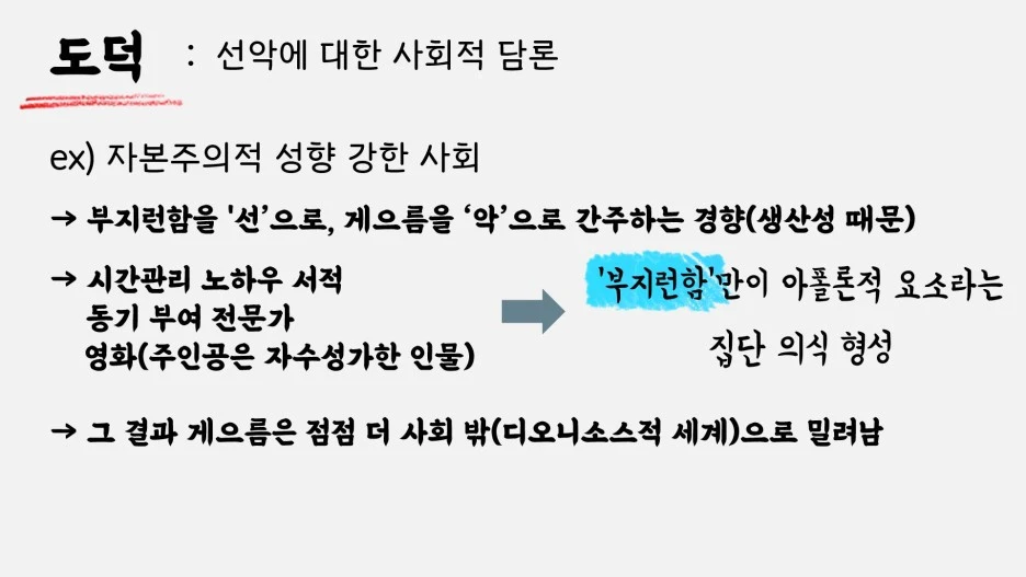 그렇다면 싱클레어는 대체 어떻게 해야 힘에의 의지를 충만하게 발휘하는 삶을 살 수 있을까요? 이에 대한 실마리는 성경을 대하는 데미안의 태도로부터 찾을 수 있습니다. 데미안은 오랜 기독교 전통에서 각각 죄인과 의인으로 다루어지던 카인과 아벨을 정반대로 해석하는 과감함을 보이는가 하면, 또한 죽을 때까지 자신의 죄를 뉘우치지 않은 도둑을 가리켜 도리어 당당한 삶을 살다 간 인물이라고 치켜세우곤 하죠. 이는 선과 악에 대한 기존의 해석을 따르지 않으려는 저항정신, 니체식으로 말하면 반도덕주의라 할 수 있습니다. 다만 이 개념은 오해가 발생하기 쉬운 대목이므로 좀 더 살펴보도록 하겠습니다. 먼저 도덕이란 선과 악에 대한 사회적 합의라고 할 수 있죠. 그런데 과연 사회가 규정한 선과 악은 절대적 가치일까요? 예를 들어 자본주의적 요소가 짙은 사회에서는 부지런함을 선으로, 게으름을 악으로 간주하는 경향이 있습니다. 따라서 그러한 사회는 시간관리 비결을 다룬 책들이나, 열심히 살라고 외치는 동기부여 전문가들, 혹은 부지런한 사람들의 성공기를 담은 매체물들을 대량으로 생산하여 부지런함만이 아폴론적 세계에 속할 수 있다고 공론화하곤 하죠. 그 결과 게으름은 점점 더 사회 밖으로 밀려나게 되며, 심지어는 극복해야 할 악덕으로 굳어집니다.