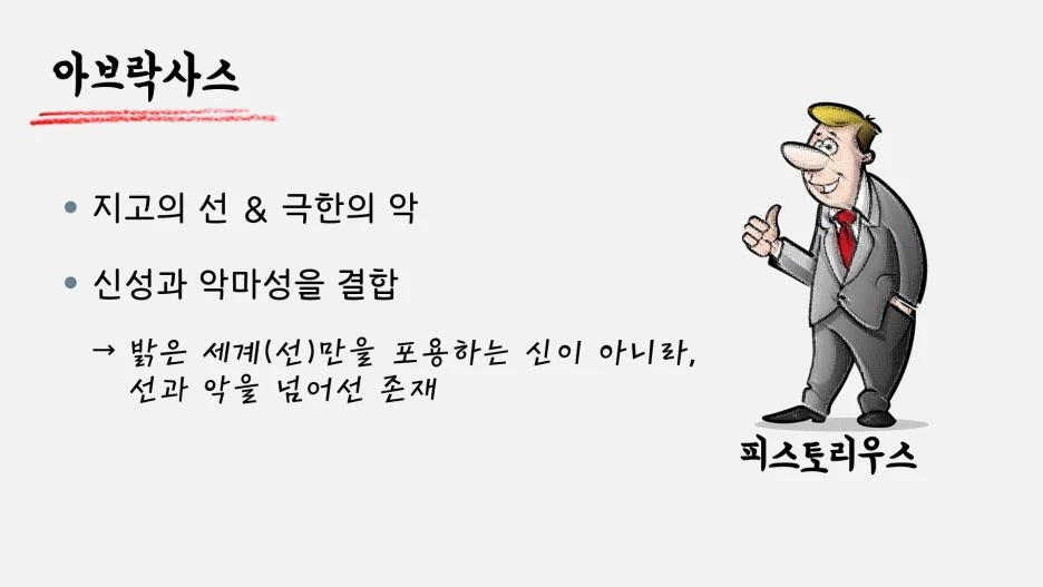 싱클레어는 불현듯 떠오른 데미안의 편지를 다시금 이해해보려 노력하지만 만족스러운 답에 이르진 못합니다. 그러던 어느 날 싱클레어에게 도움을 줄 또 다른 인물이 나타납니다. 그의 이름은 피스토리우스였으며, 기독교 가정에서 자란 신학생이었죠. 그는 싱클레어에게 데미안의 편지에 등장한 아브락사스를 설명해주죠. 그에 따르면 아브락사스는 지고의 선인 동시에 극한의 악입니다. 다시 말해 아브락사스는 신성과 악마성을 결합시키는 존재, 즉 밝은 세계만을 포용하는 선한 신이 아니라 선과 악을 넘어선 초월적 존재라 할 수 있죠.