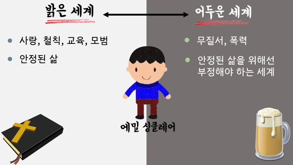 이상으로 데미안의 줄거리를 간단히 살펴봤습니다. 이제 본격적으로 작품에 담긴 니체의 흔적을 살펴보도록 하겠습니다. 어릴 적 싱클레어는 자신의 집에서 두 세계를 목격합니다. 그에 따르면 한 세계는 사랑과 철칙, 교육과 모범의 세계로서, 안정된 삶을 바라는 사람들이 머무르는 밝은 세계입니다. 반면 또 다른 세계는 무질서하고 폭력적이며, 강한 악취를 풍기는 세계로서 안정된 삶을 살기 위해선 반드시 부정해야 하는 어두운 세계이죠.