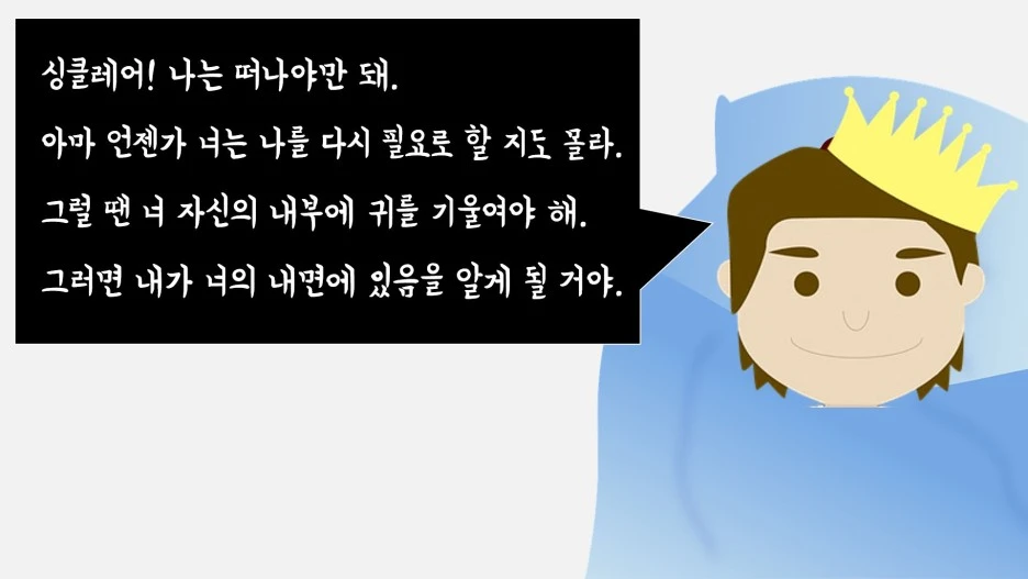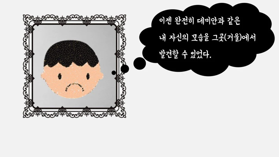 이 말을 남긴 데미안은 정말 사라져버렸고 싱클레어는 홀로 남아 부상을 치료하게 되죠. 얼마 지나지 않아 싱클레어는 거울을 보며 다음과 같이 말합니다.