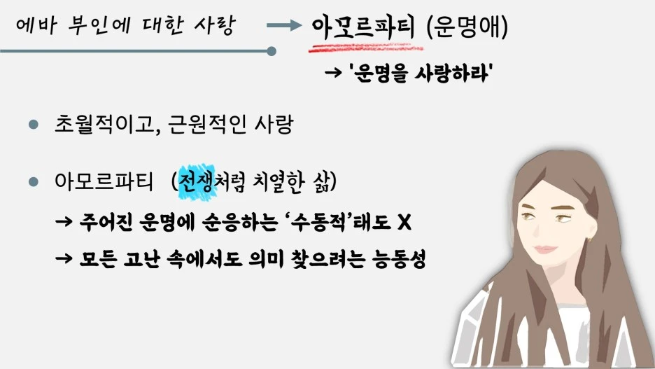 소설의 후반부에 싱클레어는 에바 부인을 만나며 운명적 사랑을 느낍니다. 다만 이 감정은 베아트리체에게 느꼈던 성적인 사랑과는 다른, 보다 초월적이고 근원적인 사랑으로 묘사되는데요. 이는 니체식으로 해석하면 아모르파티, 즉 운명애라 할 수 있습니다. 아모르파티란 쉽게 말해 운명을 사랑하라는 의미로서, 니체는 우리에게 자기 자신의 운명을 긍정하고 포용하며, 심지어는 사랑해야 한다고 이야기하죠. 다만 니체가 말하는 아모르파티란 주어진 운명에 순응하라는 수동적인 태도가 아닙니다. 진정한 아모르파티란 인생의 고난 속에서도 의미를 찾으려 분투하는, 그야말로 전쟁처럼 치열한 삶을 의미하죠. 그런 의미에서 소설의 끝머리가 전쟁으로 마무리되는 대목이 매우 인상적입니다. 이는 곧 삶이란 저마다 스스로에게 이르는 전쟁 같은 길이며, 오직 전쟁을 치른 자만이 자기 삶의 주인이 될 수 있음을 뜻하는 것이 아닐까요?