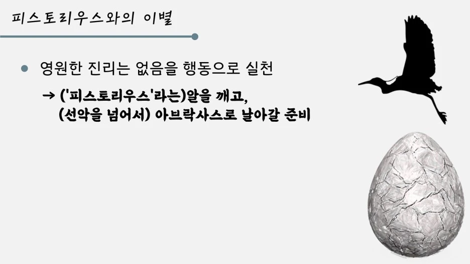 하지만 아직 싱클레어의 성장은 갈 길이 멉니다. 자기 삶의 진정한 주인이 되기 위해선 단지 두 세계를 통합하는 단계를 지나, 마침내 두 세계를 초월한 아브락사스적 자유를 누려야 하기 때문이죠. 바로 이때 싱클레어에게 큰 도움을 주는 인물이 피스토리우스입니다. 그는 아브락사스의 의미를 싱클레어에게 처음 알려준 인물로서 싱클레어는 그와 지적 교류를 나누며 자기 삶의 주인이 되기 위한 실마리를 깨우쳐 나가죠. 그런데 눈여겨볼 대목은 오히려 그 다음입니다. 피스토리우스에게 실망한 싱클레어가 그를 마음 속에서 지워 버리기로 결심한 사건 말이죠. 이것이 싱클레어의 성장에 무척이나 중요한 이유는 자신에게 아브락사스를 가르쳐 준 사람조차 절대적 진리는 아닐 수도 있다는 사실을 행동으로 옮긴 사례이기 때문입니다. 다시 말해 싱클레어는 피스토리우스라는 알을 깨고 비로소 아브락사스를 향해 날아갈 준비를 마쳤다고 해석할 수 있죠.