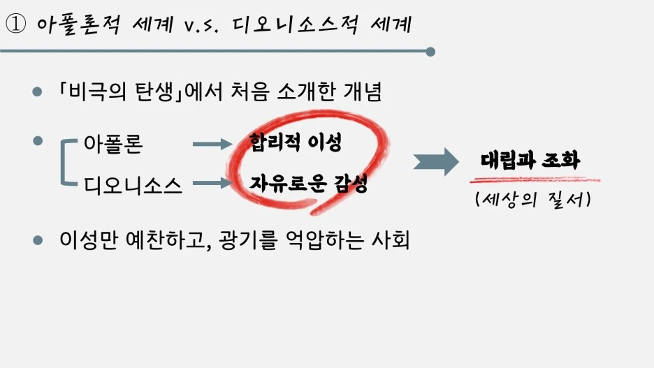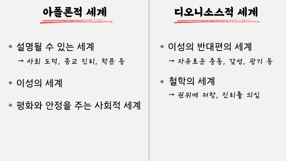 니체에 눈에 비친 당대의 서구 사회는 오로지 아폴론적 요소만을 찬양하고, 디오니소스적 요소를 억압하는 사회로 보였습니다. 즉 그가 보기에 사회는 오직 합리적 이성만을 최고의 선으로 여기며, 이성으로 설명되지 않는 충동과 광기는 열등한 악으로, 심지어 존재하지 않는 것처럼 간주해왔다는 거죠. 하지만 니체는 두 요소의 대립과 조화야말로 세상의 질서라고 생각했습니다. 마치 동양 철학에서 음양을 천지만물의 원리라고 보는 것과 비슷한 맥락이죠. 정리하면 우리는 세상을 아폴론적 세계로만 한정할 것이 아니라 디오니소스적 세계 또한 우리의 세계임을 인정해야 한다는 것입니다. 쉽게 말해 인간은 이성적 질서 위에 머무를 뿐만 아니라 광기와 충동의 존재이기도 하다는 말이죠.