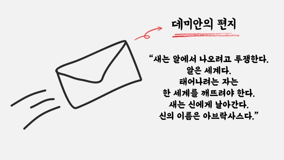 하지만 다시 시간이 흘러 싱클레어는 상급 학교로 진학하게 되고, 둘은 헤어지게 됩니다. 새로 간 학교에서 싱클레어는 학교 생활에 적응하지 못한 채 방황하기 시작합니다. 그는 매일 밤 만취할 때까지 술을 마시며 방탕한 나날을 보내곤 했죠. 그러던 어느 날 싱클레어는 우연히 한 소녀에게 마음을 빼앗깁니다. 소녀의 이름을 알지 못한 싱클레어는 그녀에게 베아트리체라 이름 붙이고는 그녀에 대한 순수한 사랑에 힘입어 그간의 방탕한 삶을 완벽히 정리하죠. 그로부터 얼마 후 싱클레어가 방 안에서 혼자 베아트리체의 얼굴을 그릴 때였습니다. 그림을 다 그리고 보니 그가 그린 그림 속 얼굴은 베아트리체가 아니라 꼭 데미안과 닮아 보였죠. 물끄러미 그림을 보던 싱클레어는 그동안 까맣게 잊고 지낸 데미안의 편지를 떠올리게 됩니다. 편지의 내용은 일전에 싱클레어가 자신의 꿈을 해석해달라고 부탁한 데 대한 데미안의 답신이었으며 내용은 이렇습니다.