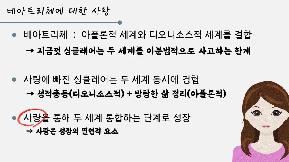 시간이 흐른 뒤 상급학교로 진학한 싱클레어는 데미안을 잊은 채 방탕한 나날을 보내기 시작합니다. 이때 데미안과의 이별은 곧 힘에의 의지를 상실한 삶을 뜻하므로 어쩌면 싱클레어의 타락은 당연한 결과일 지도 모르죠. 그러나 다행히도 싱클레어는 스스로의 힘으로 방황을 극복합니다. 베아트리체에 대한 사랑의 힘으로 그간의 방탕한 생활을 완벽하게 정리한 것입니다. 바로 여기서 싱클레어가 빠진 사랑의 의미를 분석하면 베아트리체는 아폴론적 세계와 디오니소스적 세계를 결합시켜주는 역할이라 해석할 수 있는데요. 사실 여태껏 싱클레어는 두 세계를 이분법적으로 사고하는 단계를 뛰어넘지 못했습니다. 예컨대 크로머에게 압도되었을 땐 디오니소스적 세계에서 빠져나오지 못했으며, 또한 그로부터 탈출한 뒤엔 다시 가정으로 돌아와 아폴론적인 안정감을 만끽했죠. 또한 상급학교로 진학한 뒤엔 또다시 디오니소스적 세계에 탐닉한 채 시간을 허비했고 말이죠. 하지만 사랑에 빠진 싱클레어는 마침내 두 세계를 동시에 경험하게 됩니다. 이를테면 싱클레어는 베아트리체에게 성적 충동, 즉 디오니소스적 욕망을 갖는 동시에, 그간의 방탕한 삶을 정리하려 노력한다는 점에서 아폴론적 이성을 발휘하는 것입니다. 즉 싱클레어는 사랑을 통해 비로소 두 세계를 통합하는 단계로 한 걸음 성장할 수 있었던 것이며, 이로써 사랑이란 인간의 성장에 필연적 요소임을 헤르만 헤세는 넌지시 말하는 것입니다.