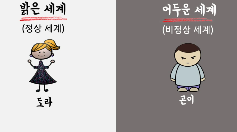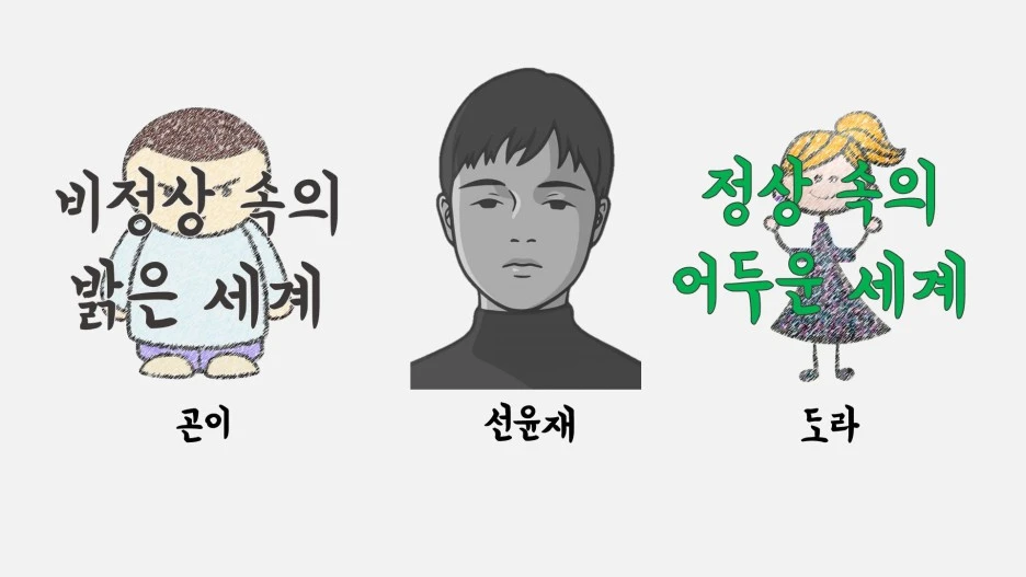 윤재 앞에 등장한 이 두 인물은 홀로 선 윤재가 직면한 두 세계를 상징합니다. 이를테면 곤이는 싱클레어가 직면한 어두운 세계, 혹은 비정상 세계를 가리키며, 반면 도라는 밝은 세계, 혹은 정상 세계를 나타낸다고 할 수 있죠. 다만 오해는 없으시기 바랍니다. 앞서 정상과 비정상이라는 것은 그저 정상 세계가 제멋대로 만들어낸 임의의 규칙에 지나지 않는다고 이야기했었죠. 즉 곤이를 불량한 아이로 여기며 비정상이라 규정한 것도, 혹은 도라의 밝은 모습을 치켜세우며 정상이라 규정한 것도 실은 사회가 제멋대로 생산한 허울 뿐인 질서에 불과하다는 것입니다. 윤재는 곤이에 대하여 다음과 같이 말합니다.