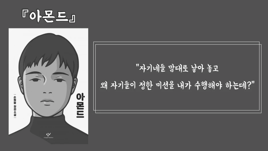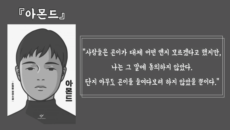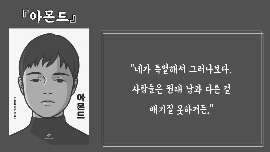 소설의 주인공은 ‘선윤재’라는 이름의 어린 아이입니다. 소위 아몬드라 불리는 편도체--감정 정보를 처리하는 뇌 속의 신경 집합체--가 선천적으로 매우 작게 태어난 윤재는 감정 정보를 처리하는 기능이 현저히 떨어졌죠. 따라서 윤재는 무서운 것을 봐도 공포를 느끼지 못하며, 남들의 불행을 보아도 전혀 공감하지 못하는 이른바 감정장애를 갖고 살아가게 됩니다. 다시 말해 윤재는 싱클레어가 발견한 어두운 세계, 즉 사회가 비정상으로 규정한 세계에 속한 인물이라 할 수 있죠. 그렇다 보니 윤재는 늘 어머니의 걱정거리였습니다. 남들과 다르다는 것을 들키는 순간 윤재가 떠안게 될 삶의 짐을 어머니는 그 누구보다 잘 알았기 때문이죠. 따라서 어머니는 매일 마다 윤재에게 상황별로 적절한 말을 주입식으로 암기시킵니다. 즉 윤재 어머니는 어떻게든 윤재를 정상 세계로 편입시키기 위해 갖은 애를 쓴 것이죠.