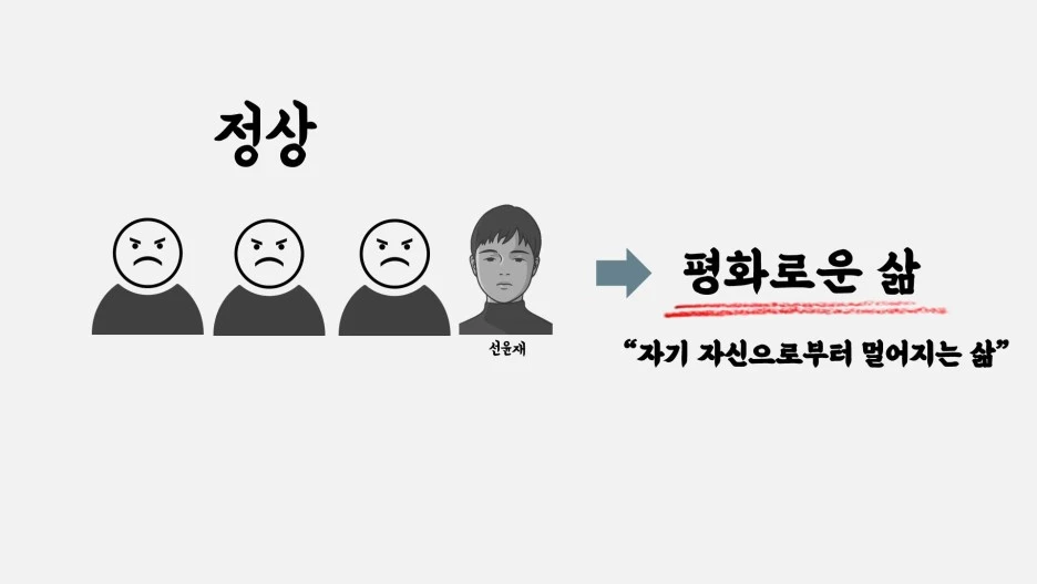 윤재의 열 여섯 번째 생일날인 크리스마스 이브 때의 일입니다. 윤재와 어머니는 생일을 축하하기 위해 바깥 나들이에 나서죠. 그런데 이때 자신의 신세를 비관한 거리의 한 남자가 그만 윤재의 어머니를 상대로 별안간 흉기를 들고 맙니다. 어린 윤재는 어머니가 낯선 남자에게 당하는 장면을 그저 묵묵히 바라볼 뿐이었으며, 이로써 윤재는 세상에 홀로 남겨지게 되죠. 즉 윤재는 정상 세계의 질서로부터 해방되어 자기 자신만의 고유한 규칙에 따라 살 수 있게 된 것입니다. 하지만 학교로 돌아간 윤재를 향한 시선은 그리 곱지 않았습니다. 학교 아이들은 윤재의 어머니 사건을 두고 수군수군 대며, 특히 자기 어머니가 당하는 모습을 가만히 지켜만 봤다는 윤재를 이상한 아이로 여기며 멀리하죠. 이처럼 정상 세계는 끝없이 비정상 세계를 구축함으로써 자기들의 세계를 공고하게 다집니다. 다시 말해 아이들은 윤재를 이상한 아이라고 낙인 찍음으로써 자기들이 정상 세계에 속해 있음을 확인하려 한다는 거죠. 작중 윤재의 할머니는 윤재에게 다음과 같이 말합니다.